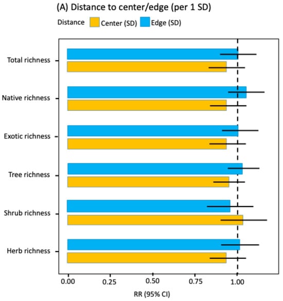 To evaluate the effects of the center-edge gradient and habitat heterogeneity on floristic richness, site-level total richness, native richness, exotic richness, and richness by life form (trees, shrubs, herbs) were modeled using GLMMs with a log link, assuming a negative binomial (NB2) distribution for each response variable. A log(area) offset was included to control for differences in sampled area, and a random intercept for municipality (1|municipality) was included to capture unobserved variation and potential spatial dependence.