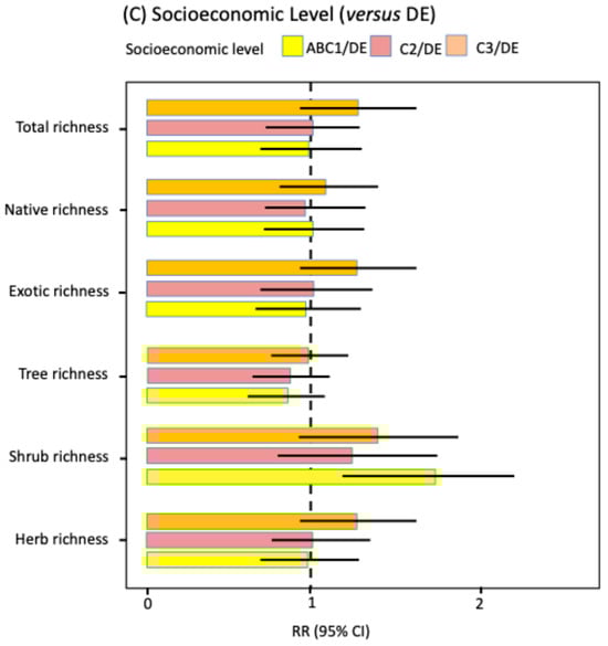 The effects of socioeconomic segment were weak and inconsistent across response variables (Figure 2C; Supplementary Material Table S2). After adjustment for multiple comparisons using the Tukey test, only one significant difference was observed: higher shrub richness in ABC1 segments compared to DE segments (RR = 1.75, p-adj = 0.004; Supplementary Material Table S3). GLMM contrasts without adjustment showed some trends (lower shrub richness in C2 and DE versus ABC1; RR ≈ 0.68 and 0.57; and higher herb and exotic richness in C3 versus ABC1; RR ≈ 1.37 and 1.32; Supplementary Material Table S3), but these effects were not significant after multiplicity correction. Consequently, except for the difference between ABC1 and DE for shrubs, no other significant differences were detected among the richness indicators.