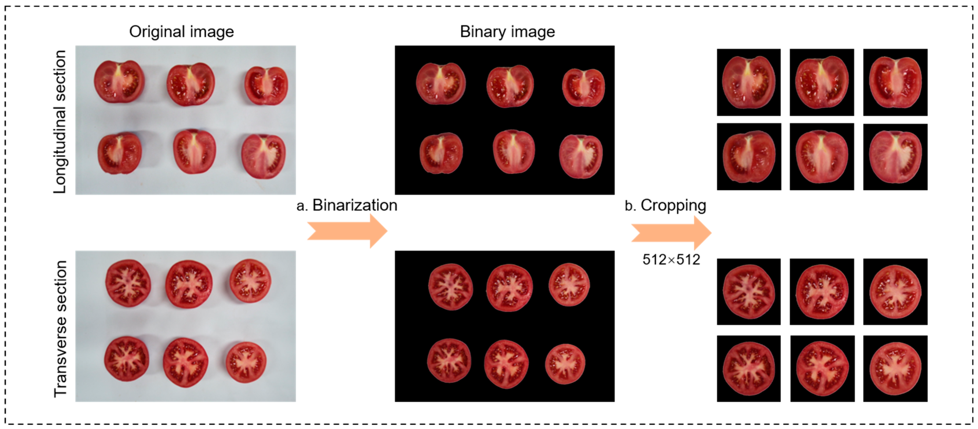 - To extract morphological features from tomato sections, this study used image processing and threshold segmentation algorithms to generate a binary mask for each tomato fruit. A minimum bounding rectangle was fitted to each tomato fruit in the image, with its height defined as the longitudinal diameter and its width as the transverse diameter. The fruit shape index was calculated as the ratio between the longitudinal and transverse diameters of the fruit.
