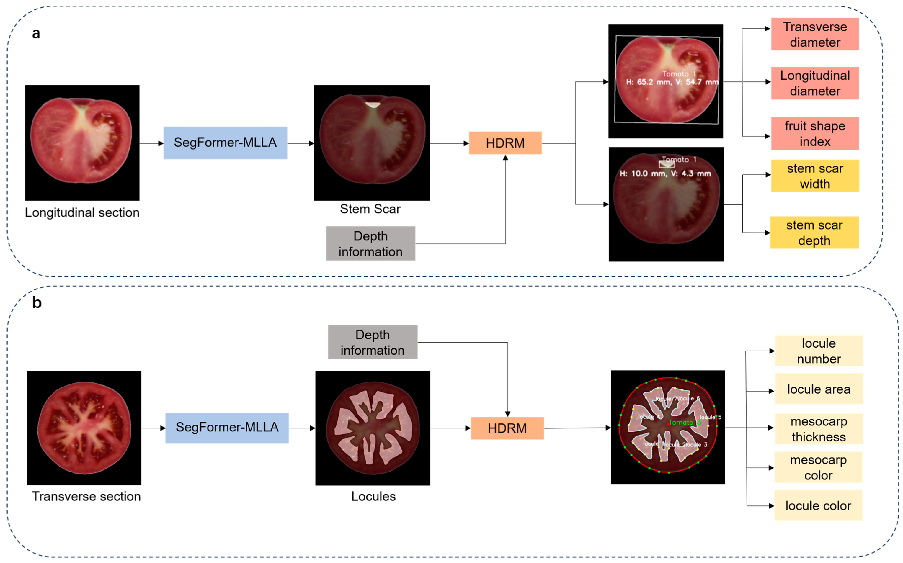 - The framework analyzes 12 phenotypic traits, including fruit transverse and longitudinal diameters, shape index, stem scar structure in the fruit, as well as stem scar depth and width, locule structure, locule number, locule area, mesocarp thickness, mesocarp color, and locule color.