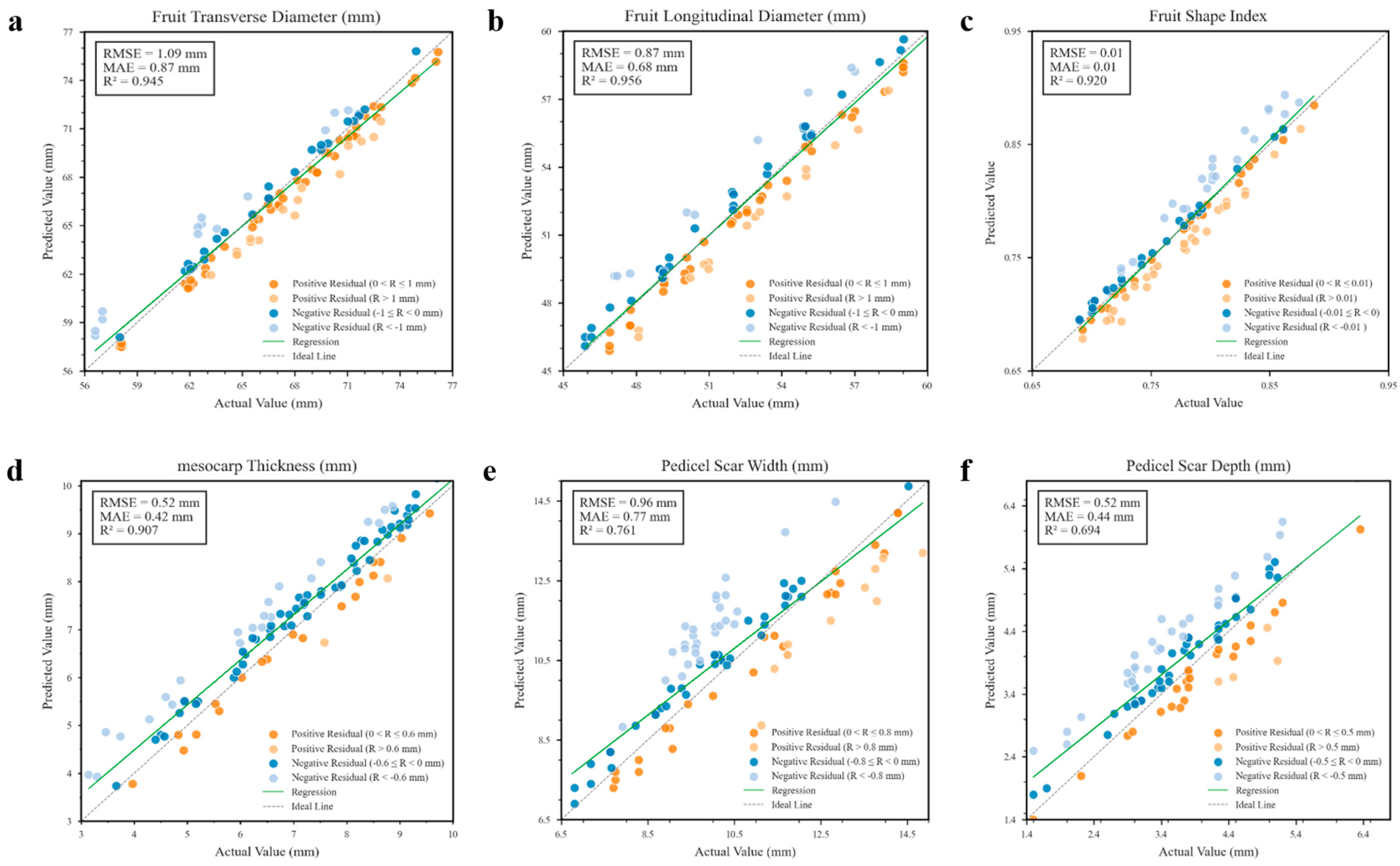 - By integrating depth information, the dimensions of tomato fruit traits were measured. To address depth information errors caused by optical interference, such as specular reflections, a Hybrid Depth Regression Model (HDRM) was designed. This model captures the optimal depth distance of the tomato fruit images through modeling parameter errors, calculating residuals, and applying random forest-based residual correction.