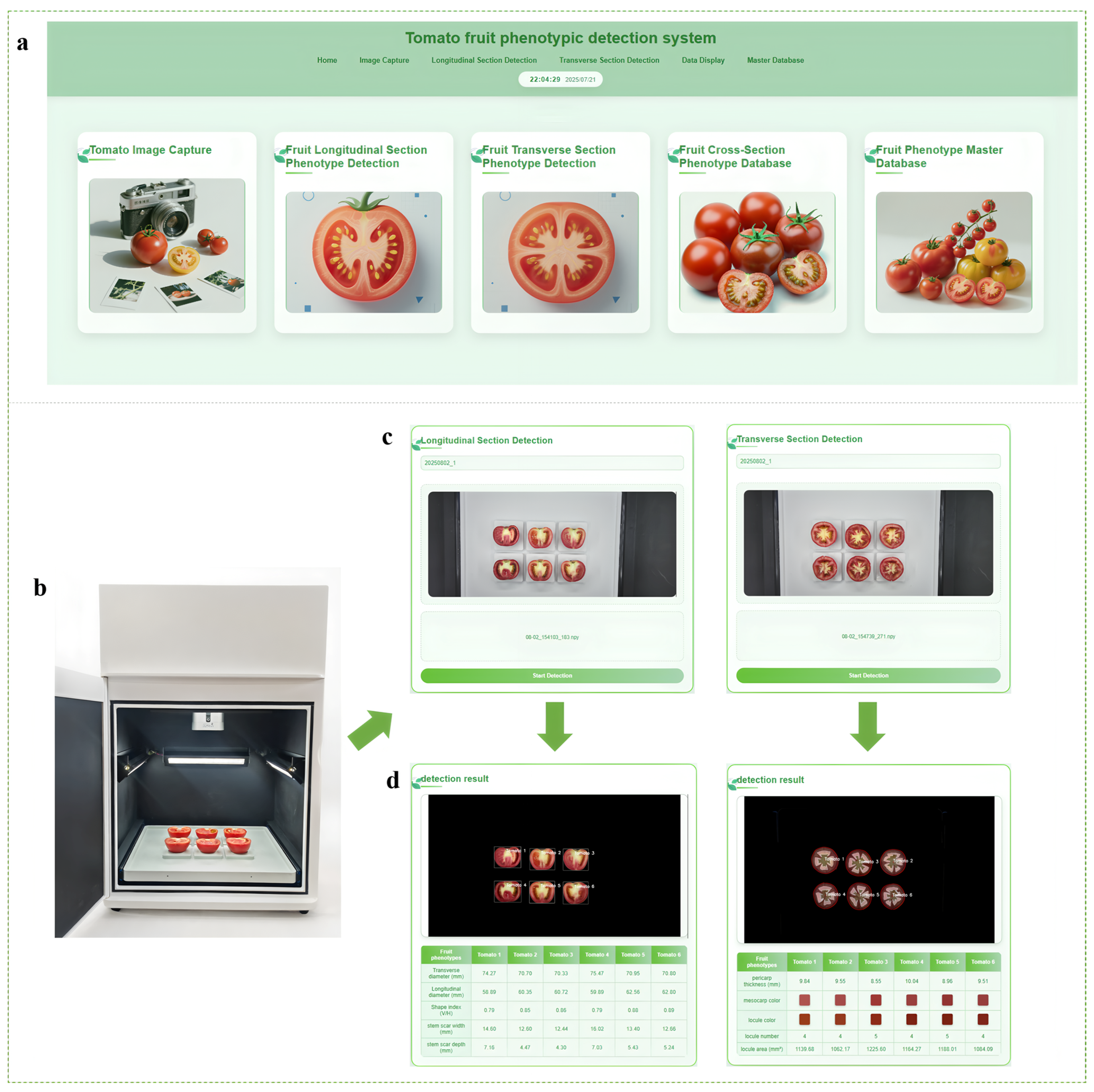 - We designed an intelligent detection system for tomato fruit phenomics analysis, which integrates both software and hardware components. During the detection process, each sample was assigned a corresponding label to establish a mapping with its phenotypic data, enabling efficient and accurate detection and data storage of tomato fruit phenotypic traits.