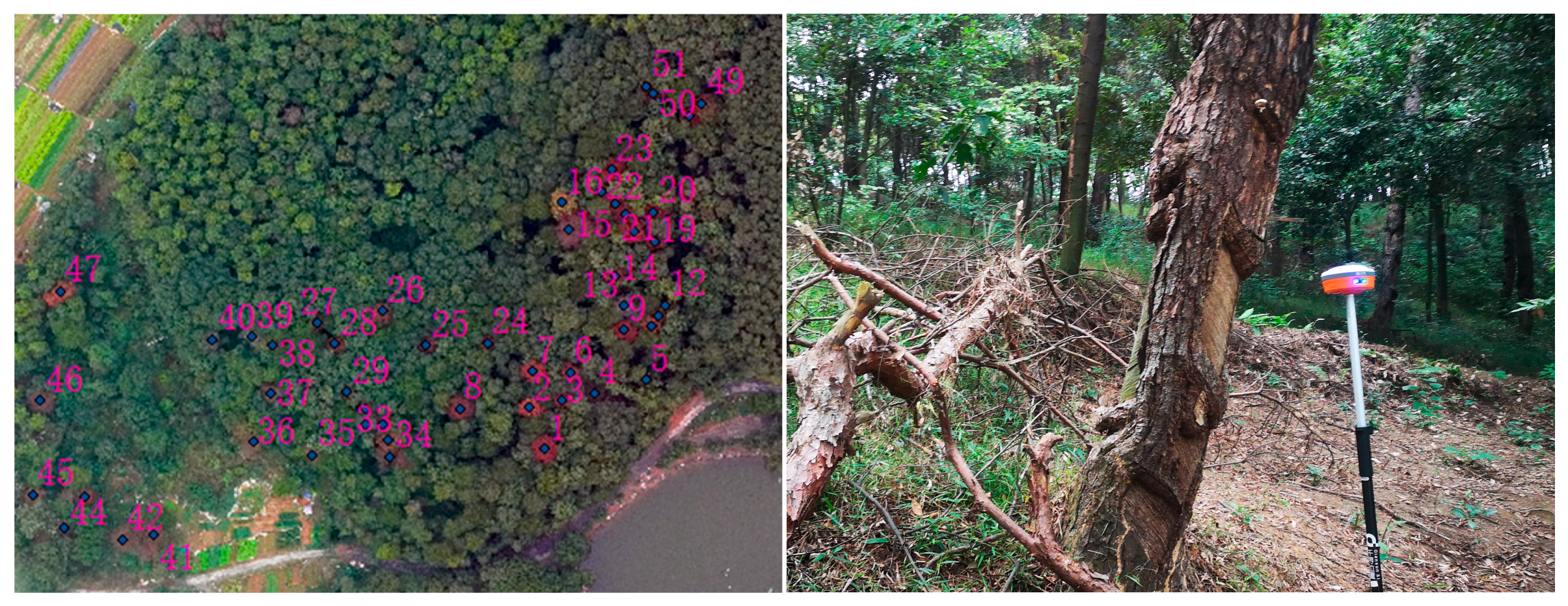 - Zhou, X.; Liao, L.; Cheng, D.; Chen, X.; Huang, Q. Extraction of the individual tree infected by pine wilt disease using unmanned aerial vehicle optical imagery. Int. Arch. Photogramm. Remote Sens. Spat. Inf. Sci. 2020, XLIII-B3-2020, 247–252. [Google Scholar] [CrossRef]