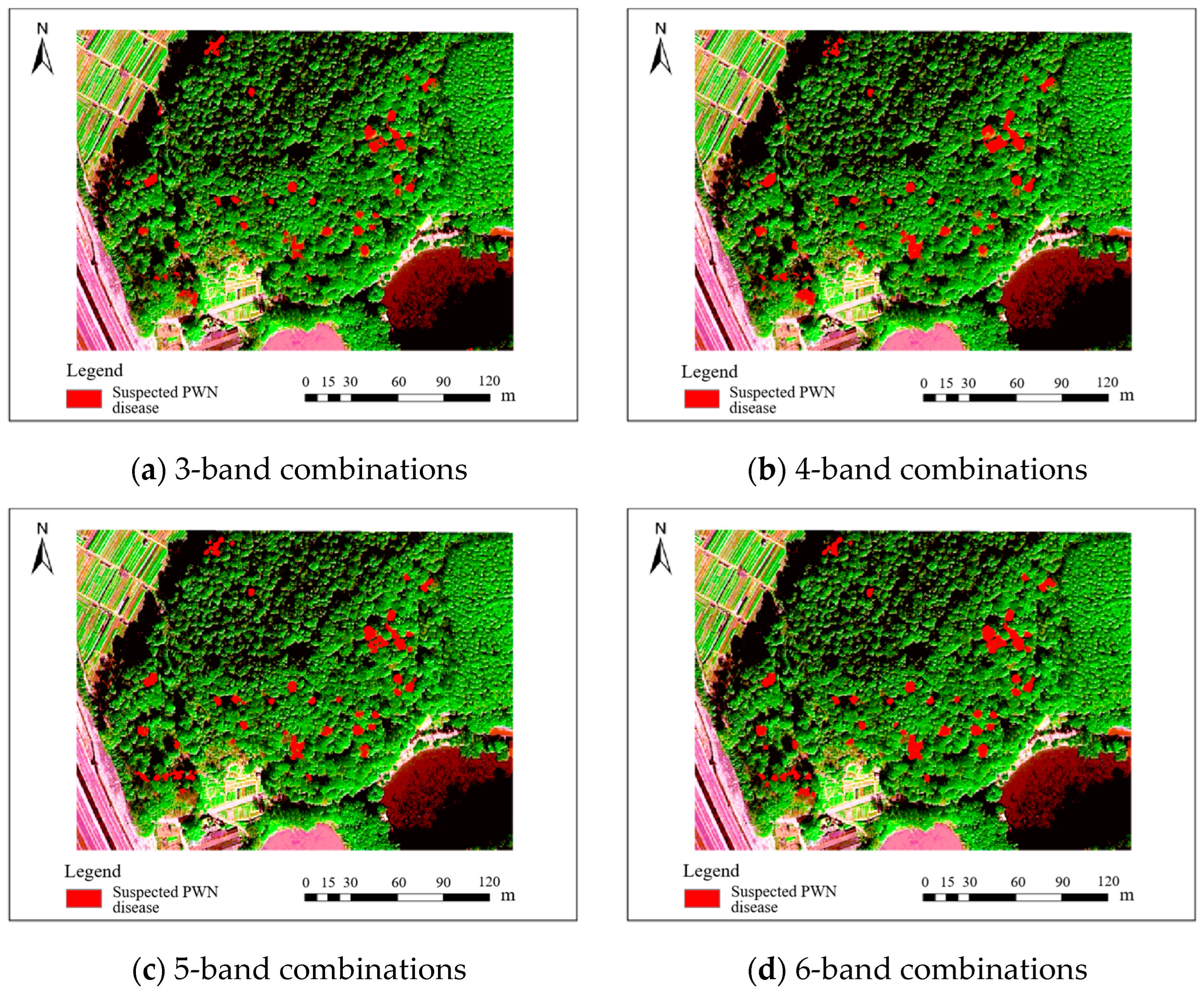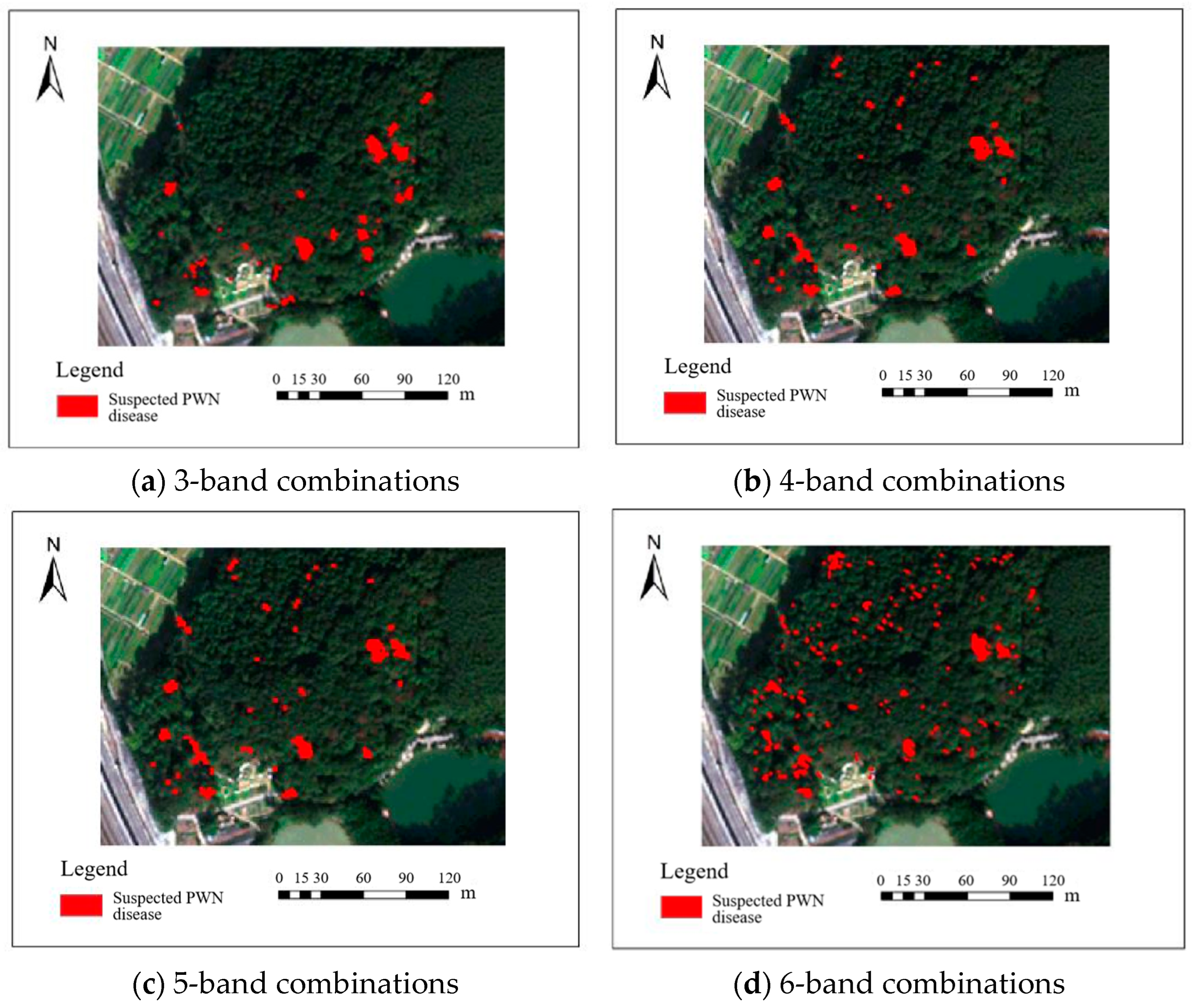 4.2. Effect of Spectral Features of Remote Sensing Imagery on Identification of PWN-Infected Trees