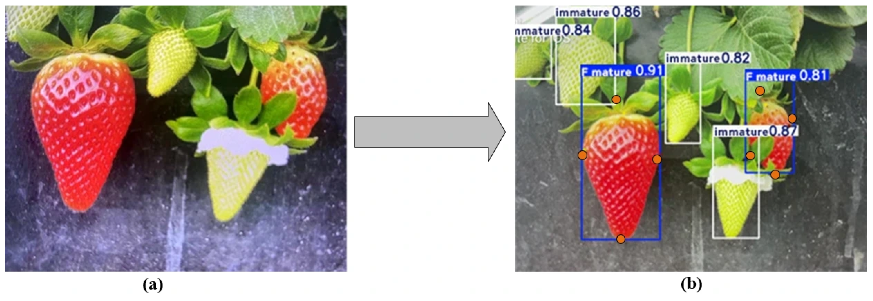 - Habaragamuwa, H.; Ogawa, Y.; Suzuki, T.; Shiigi, T.; Ono, M.; Kondo, N. Detecting greenhouse strawberries (mature and immature), using deep convolutional neural network. Eng. Agric. Environ. Food 2018, 11, 127–138. [Google Scholar] [CrossRef]