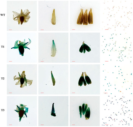 A previous study has revealed the predominant expression of CaPEX3 in flowers [38]. To further determine its expression location in floral organs, a CaPEX3 promoter::GUS fusion construct was generated and transformed into tomato. The flower-related tissues of wild-type (WT) and transgenic lines (T1–T3) were stained, and the results showed that the petals, sepals, anthers, and pollens of the transgenic lines were all stained blue, whereas no staining was observed in the corresponding tissues of the WT (Figure 1). These results confirmed that the CaPEX3 promoter exhibited promoter activity, capable of inducing GUS expression, and the gene was expressed in these test floral organs.