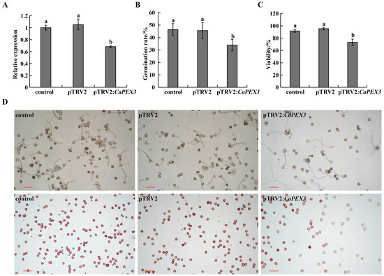 The Agrobacterium-resistant colonies containing the above vectors were added to 1 mL of LB liquid medium (50 mg·L−1 kanamycin), separately, and shaken at 28 °C and 160 rpm for 12 h. Then, they were transferred to 50 mL of LB liquid medium (50 mg·L−1 kanamycin) and shaken overnight at 28 °C and 160 rpm. The cultured bacterial liquids were centrifuged at 5000 rpm for 10 min, and then the bacteria were collected and re-suspended with the MMA buffer (10 mM of 2-Morpholinoethanesulfonic Acid, 10 mM of MgCl2, and 150 µM of acetosyringone) as the infection liquid, with the appropriate value of OD600 (0.8). After shaking at 28 °C and 160 rpm for 2 h, the Agrobacterium mixtures of pTRV1 and pTRV2 or pTRV2:CaPEX3 (1:1) were infiltrated into the lower leaves of four-leaf stage plants using a 1 mL needleless syringe. After being cultured for three days in dark conditions, the plants were transferred to light for normal growth. The second inoculation of leaves was carried out when the flower buds appeared following the above method. The uninoculated plants and those infected with pTRV2 were used as control and negative group. The expression level of CaPEX3 in the flowers at 60 days after inoculation were detected to assess the silencing efficiency of CaPEX3, and the pollens from three plants of the control, negative group, and CaPEX3-silenced plants, respectively, were collected for viability analysis. The experiment was repeated three times.