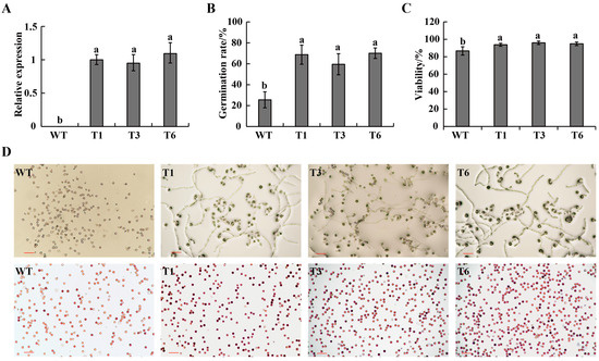 To further validate the function of CaPEX3, an overexpression vector of CaPEX3 was constructed and transformed into tomato. As revealed in Figure 3A, the expression of CaPEX3 was not detected in WT, while it was detected in the three CaPEX3- overexpressing transgenic lines (T1, T3, T6). The analysis of pollen germination in WT and transgenic lines (T1, T3, T6) revealed that the pollen germination rate of WT plants was 25.56%, while that of transgenic lines was 68.75%, 59.53%, and 70.12%, respectively, which were all significantly higher than that of WT (Figure 3B,D). Furthermore, pollen viability analysis revealed that the proportion of viable pollen of the wild type was 86.69%, while that of the transgenic lines was 93.76%, 96.00%, and 94.88%, respectively, higher than that of WT (Figure 3C,D).