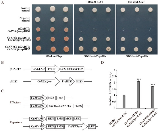 Furthermore, the relationship between transcription factors and CaPEX3 was verified by using Y1H (Figure 4A,B). As illustrated in Figure 4A, no yeast growth was observed in the negative control or empty vector groups, whereas colonies were present in the positive control group. Additionally, yeast cells carrying the CaTTG1/CaNFYC9 and CaPEX3 promoter exhibited growth on the selective medium, suggesting that the CaTTG1 and CaNFYC9 proteins were both capable of binding to the CaPEX3 promoter. To further validate these regulatory relationships, dual-luciferase reporter (Dual-LUC) assays were conducted, demonstrated that CaTTG1/CaNFYC9 enhanced the promoter activity of CaPEX3 (Figure 4C,D).