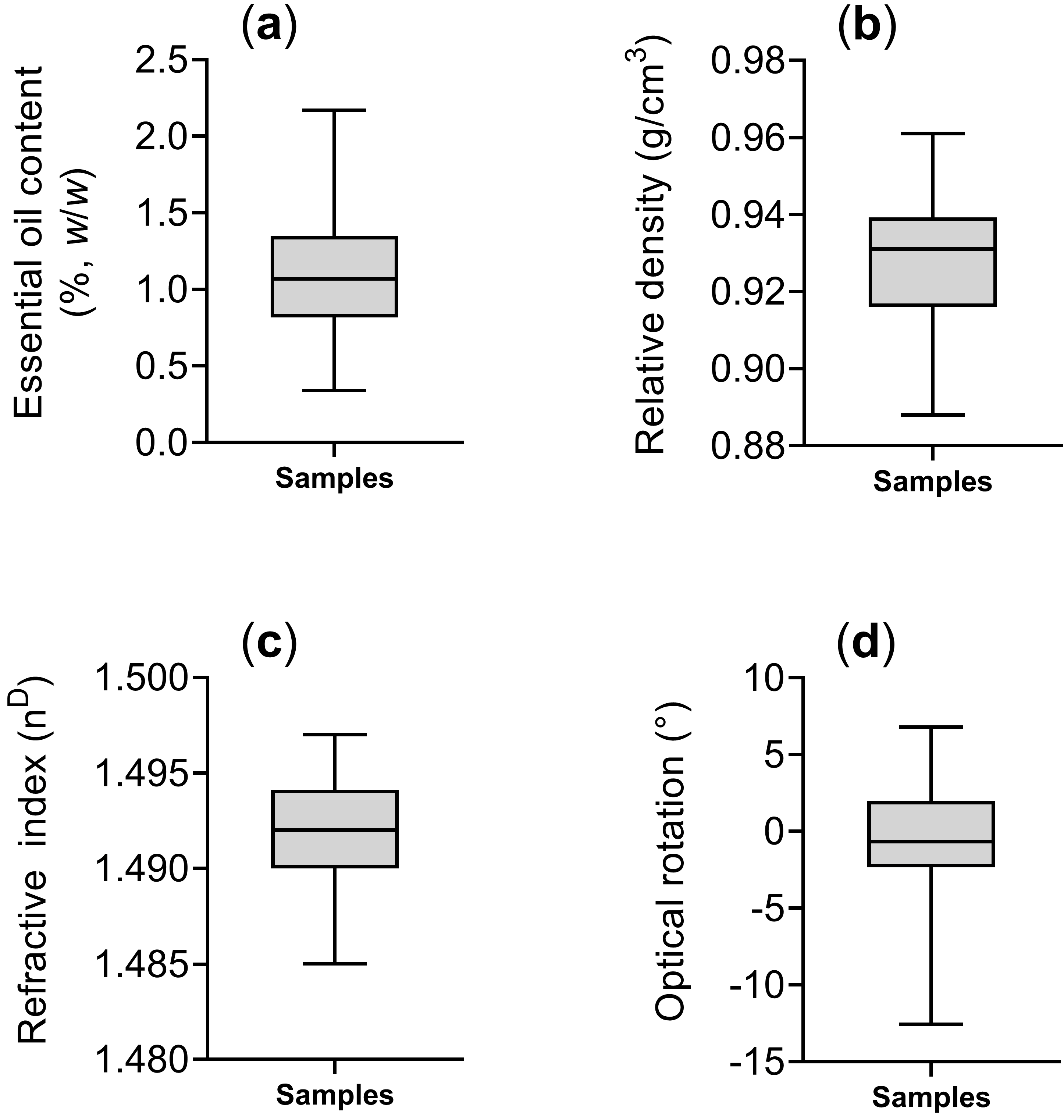 - ISO 280:1998; Essential Oils—Determination of Refractive Index. ISO: Geneva, Switzerland, 1998.