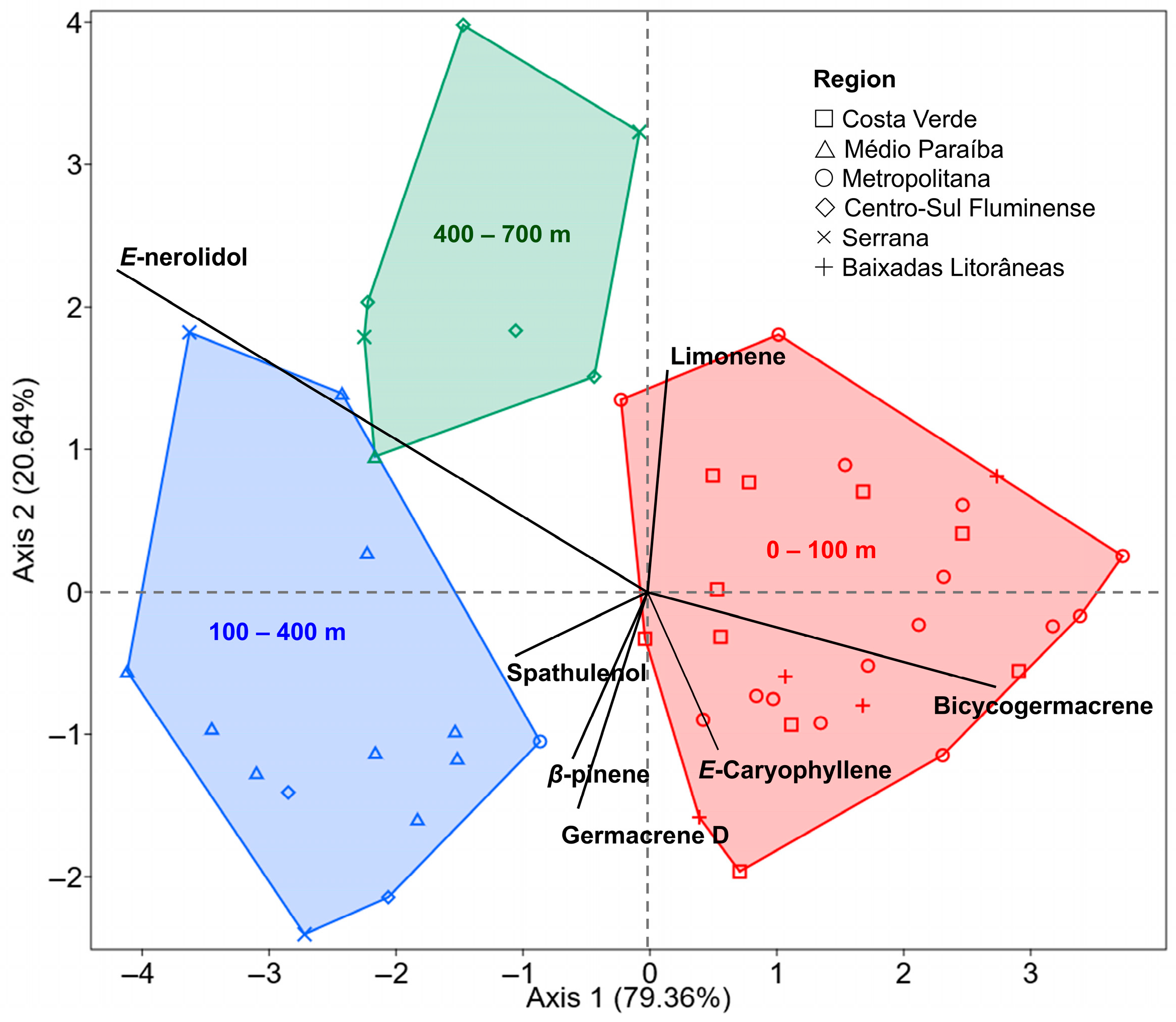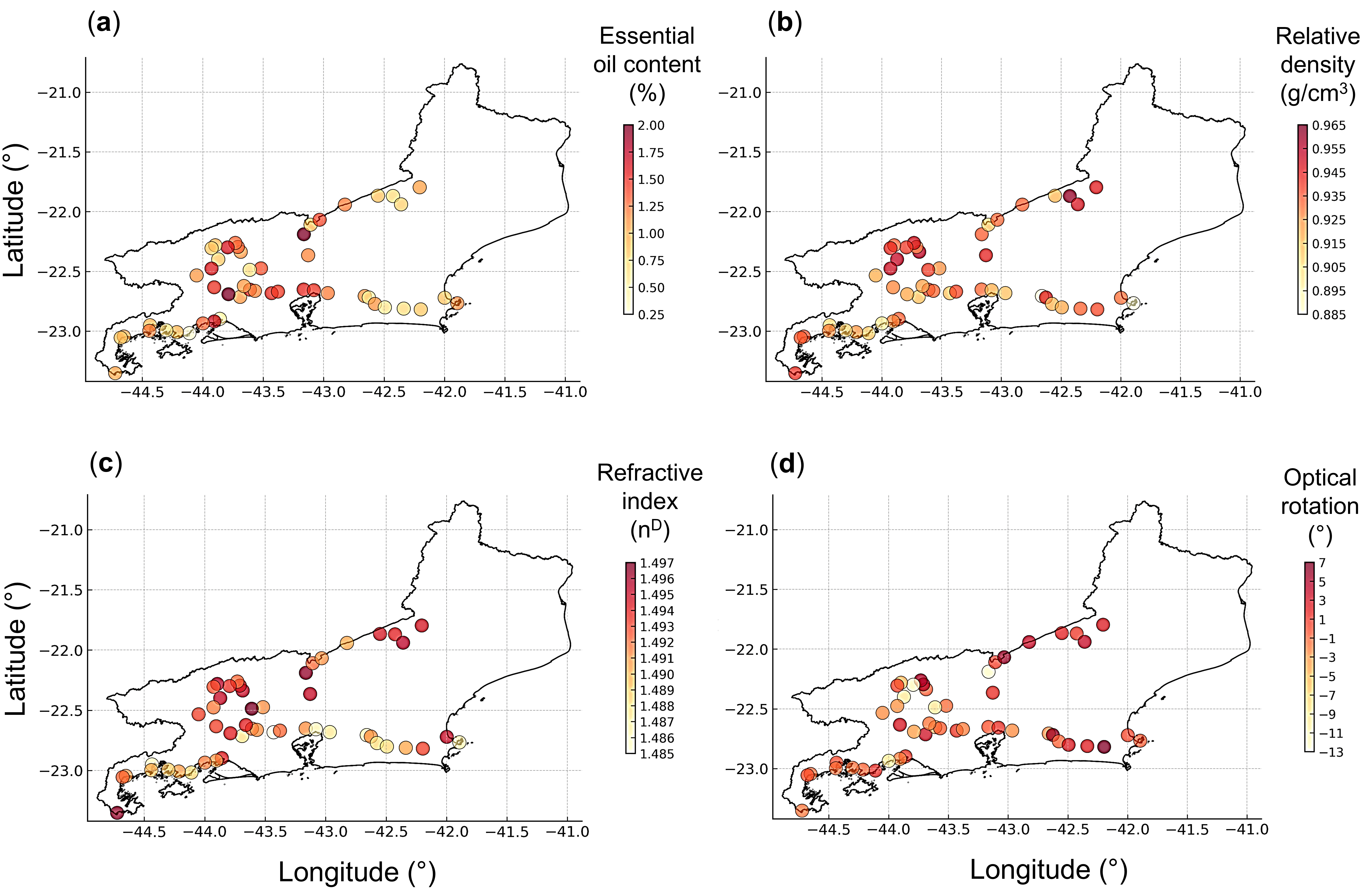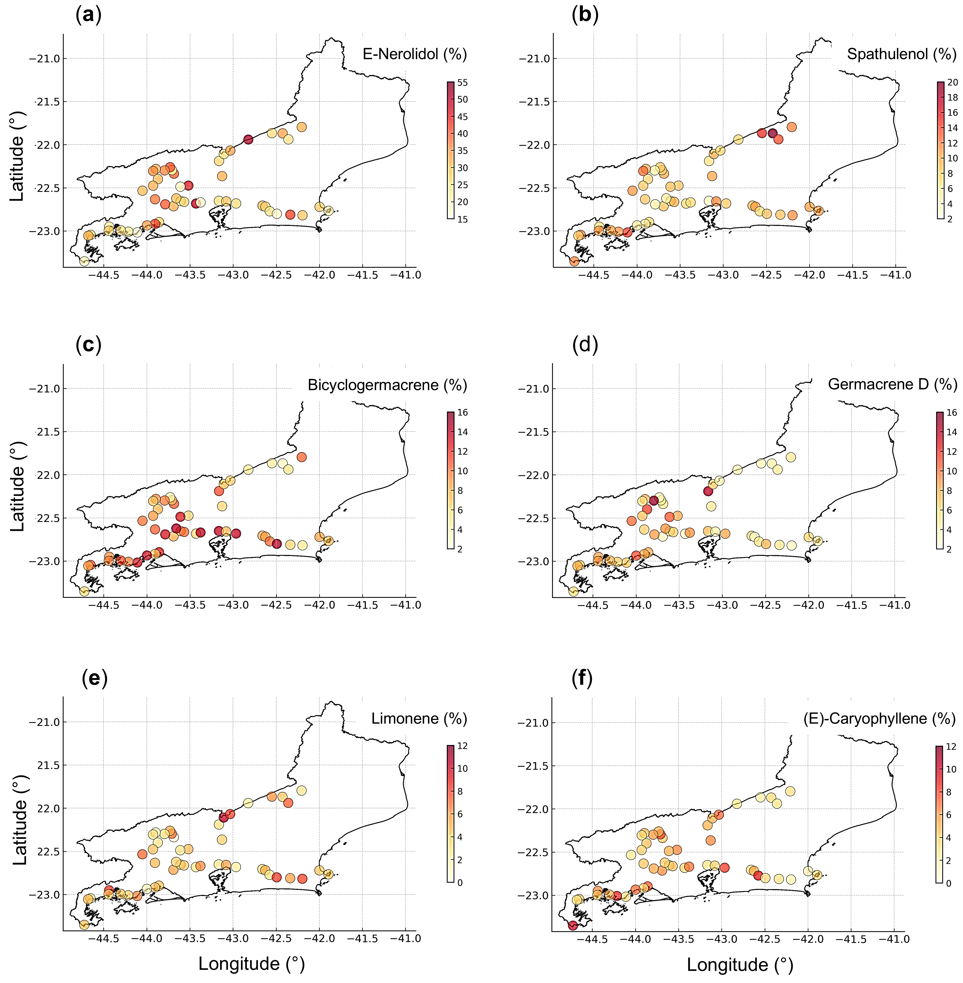 - Barros, D.J.E.; Nunes, M.Y.; da Silva Barbosa, P.C.; Mariano, J.D.R.; Santos, C.R.; da Paixao, A.D.; Reis, P.D.F.D.; da Silva, B.K.; Sampaio, F.I.; Emerick, S.M.; et al. Chemodiversity of Essential Oils from Eugenia uniflora L. Collected in Different Phytophysiognomies of the Coastal Region of Rio de Janeiro. Chem. Biodivers. 2025, early view, e01390. [Google Scholar] [CrossRef]