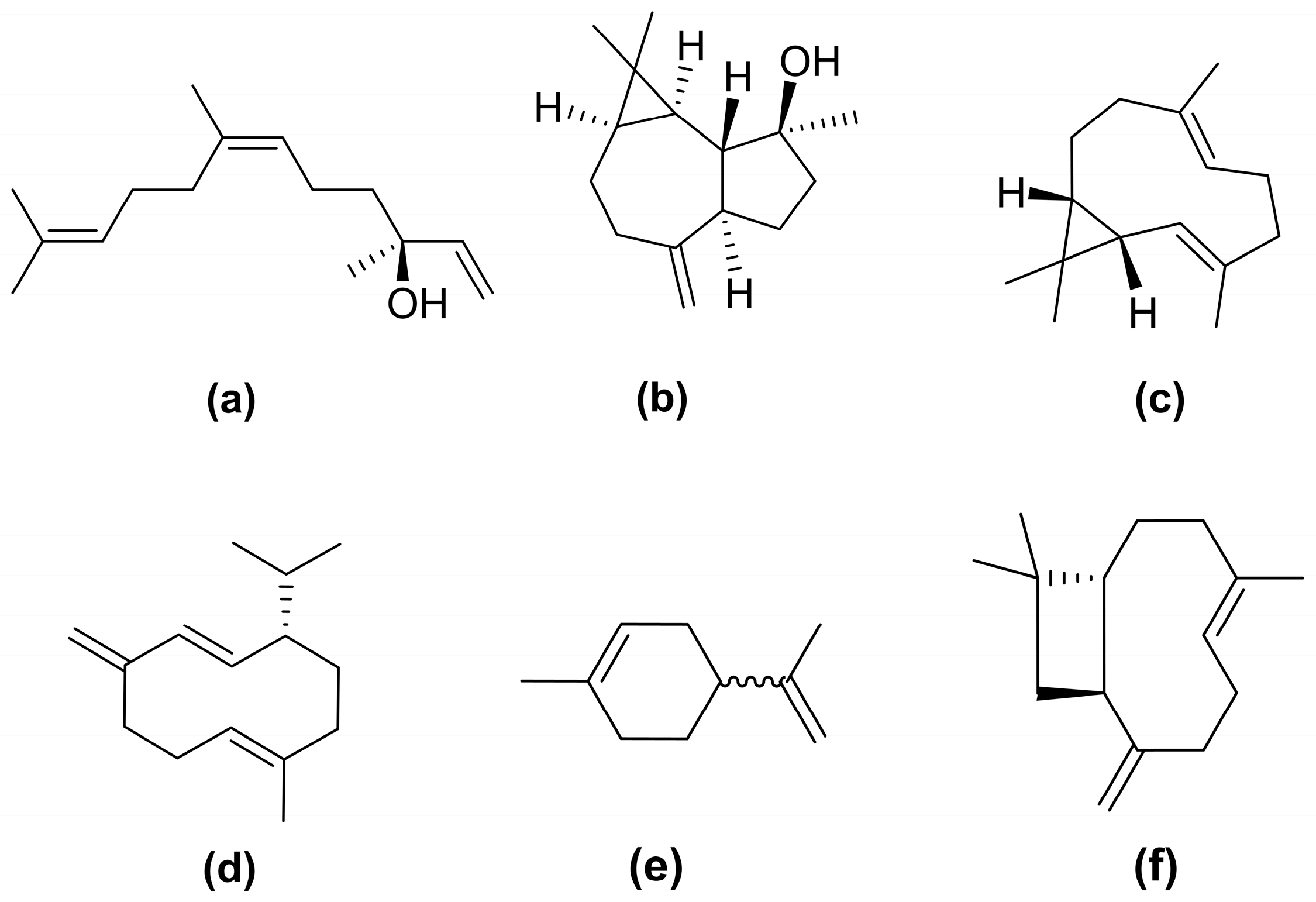 - Chan, W.-K.; Tan, L.; Chan, K.-G.; Lee, L.-H.; Goh, B.-H. Nerolidol: A Sesquiterpene Alcohol with Multi-Faceted Pharmacological and Biological Activities. Molecules 2016, 21, 529. [Google Scholar] [CrossRef]