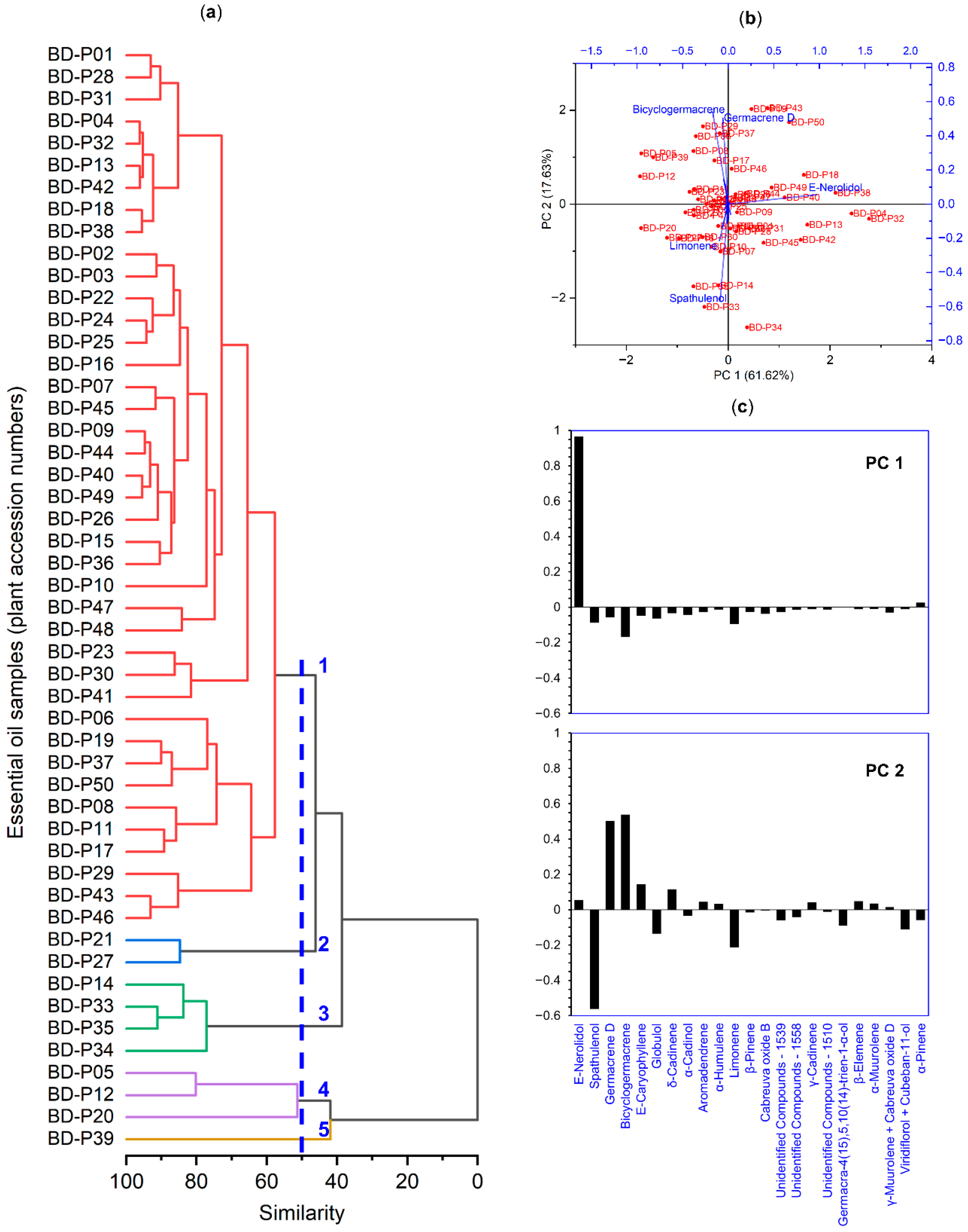| E-Nerolidol/Spathulenol | A/B | BD-P33 (25%/14%), BD-P34 (32%/19%) |