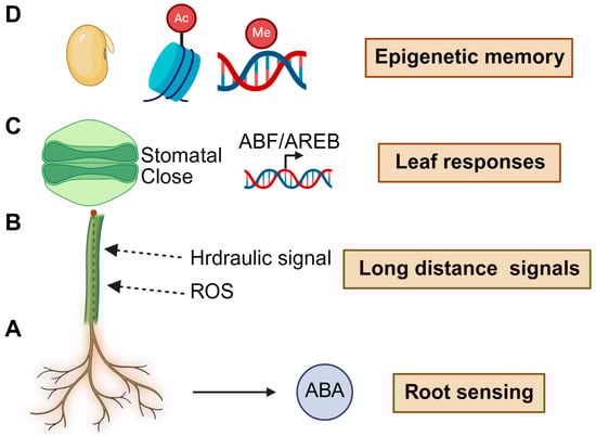 Integrated mechanisms of plant drought response: from root sensing to epigenetic memory. Drought stress triggers a multilayered response in plants that spans environmental sensing, systemic signaling, physiological adaptation, and long-term memory formation. (A) At the root level, cells detect declining soil water potential and initiate the biosynthesis of ABA. (B) These drought cues are then transmitted to aerial tissues via hydraulic signals and ROS traveling through the xylem. (C) In the leaves, ABA signaling induces stomatal closure by modulating ion channels and activates key drought-responsive transcription factors such as ABF/AREB. (D) At the chromatin level, epigenetic modifications-including histone acetylation and DNA methylation at stress-inducible loci-establish a form of drought memory, enabling plants to respond more rapidly and robustly upon re-exposure to drought, and in some cases, confer transgenerational resilience.