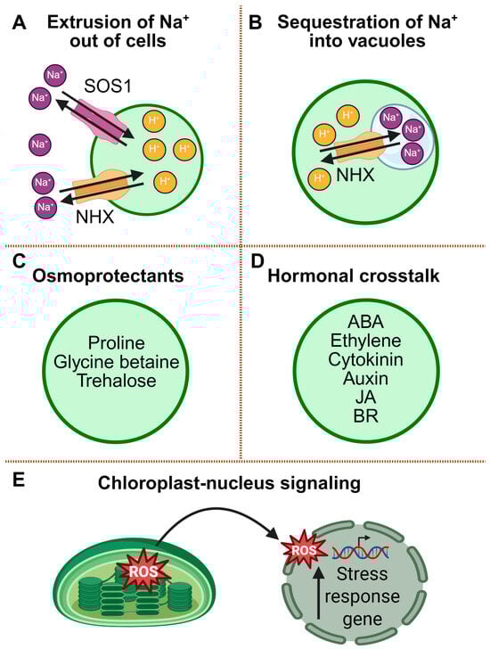 Salinity stress responses in plants. Key physiological and molecular mechanisms involved in plant adaptation to high salinity stress are shown. (A) Na+ extrusion is mediated by plasma membrane Na+/H+ antiporters (e.g., SOS1), which remove excess Na+ from the cytosol. (B) Vacuolar sequestration of Na+ via NHX-type Na+/H+ antiporters contributes to maintaining a favorable cytosolic K+/Na+ ratio. (C) Accumulation of compatible solutes such as proline, glycine betaine, and trehalose helps stabilize proteins and maintain osmotic balance. (D) Hormonal regulation involving ABA, ethylene, cytokinin, auxin, and jasmonic acid (JA) and brassinosteroid (BR) modulates stress signaling and plant development under saline conditions. (E) Salt stress induces the production of ROS in chloroplasts, which activate the expression of stress-responsive genes in the nucleus.