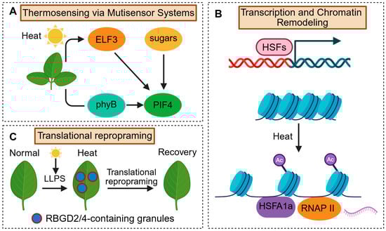 Multilayered mechanisms of plant heat stress responses. (A) Heat stress is sensed via multiple systems including phyB, ELF3, and sugar signals, all converging on PIF4 to drive thermomorphogenesis. (B) Heat activates HSFs such as HSFA1a, which induce heat-responsive gene expression and mediate chromatin remodeling. (C) Under heat, RBGD2/4 undergo LLPS to form stress granules, enabling translational reprogramming and promoting plant survival.