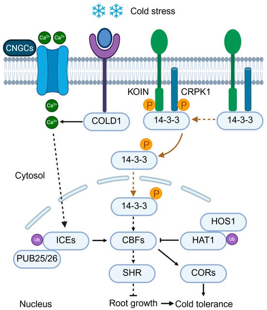 In Arabidopsis, two U-box E3 ligases, PUB25 and PUB26, dynamically regulate ICE1 stability via differential ubiquitination during cold stress. Specifically, during the early stages of cold stress, PUB25/26 promotes K63-linked ubiquitination of ICE1, thereby stabilizing ICE1 and maximizing the expression of CBF. In contrast, prolonged cold exposure induces K48-linked ubiquitination of ICE1, which in turn leads to the degradation of ICE1 and the attenuation of the cold response [] (Figure 4). This regulatory axis enables the rapid activation of CBF3 and its homologs within hours of cold stress onset. Notably, OST1-previously characterized in ABA signaling-links drought and cold stress responses by modulating the activity of ICE1. Beyond cold acclimation, CBF3 has also been demonstrated to play a crucial role in root development under cold stress: it maintains the identity of the root stem cell niche and meristem activity, thereby coupling stress adaptation with growth regulation []. Recent studies further revealed that a plasma membrane-localized RLK-RLCK module, comprising KOIN and CRPK1, modulates cold-induced root growth inhibition via the 14-3-3-CBF-SHR signaling axis. This module links the activity of CBF3 to root meristem regulation under cold stress [] (Figure 4). ICE1-CBF functions as a dynamic switch with time-phased ubiquitination logic, not a static pathway.