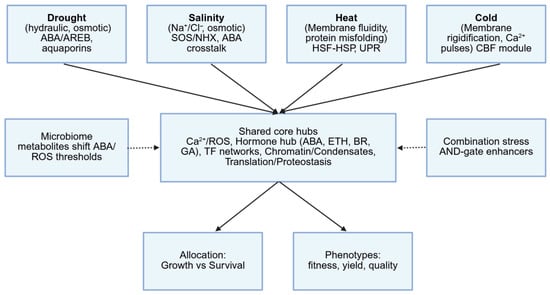 Conceptual framework linking single- and combined-stress responses. Drought, salinity, heat and cold converge on shared hubs (Ca2+/ROS, hormone crosstalk, TF networks, chromatin/condensates, translation/proteostasis) that allocate outputs to growth vs. survival and phenotypes. Dashed elements mark testable features relevant to combinations-AND-gate enhancers and microbiome-shifted ABA/ROS thresholds-which help explain the drought + heat conflicts (e.g., ABA-driven closure vs. heat-driven cooling) and salinity + cold co-regulation (CBF regulon with ion homeostasis and antioxidant programs). This schematic provides the backdrop for Section 2.5.1 and Section 2.5.2, where we detail ELF6-mediated DH acclimation, glutathione dependence under cold + osmotic stress, and the MsMYB12→MsFLS13 flavonoid module in alfalfa.