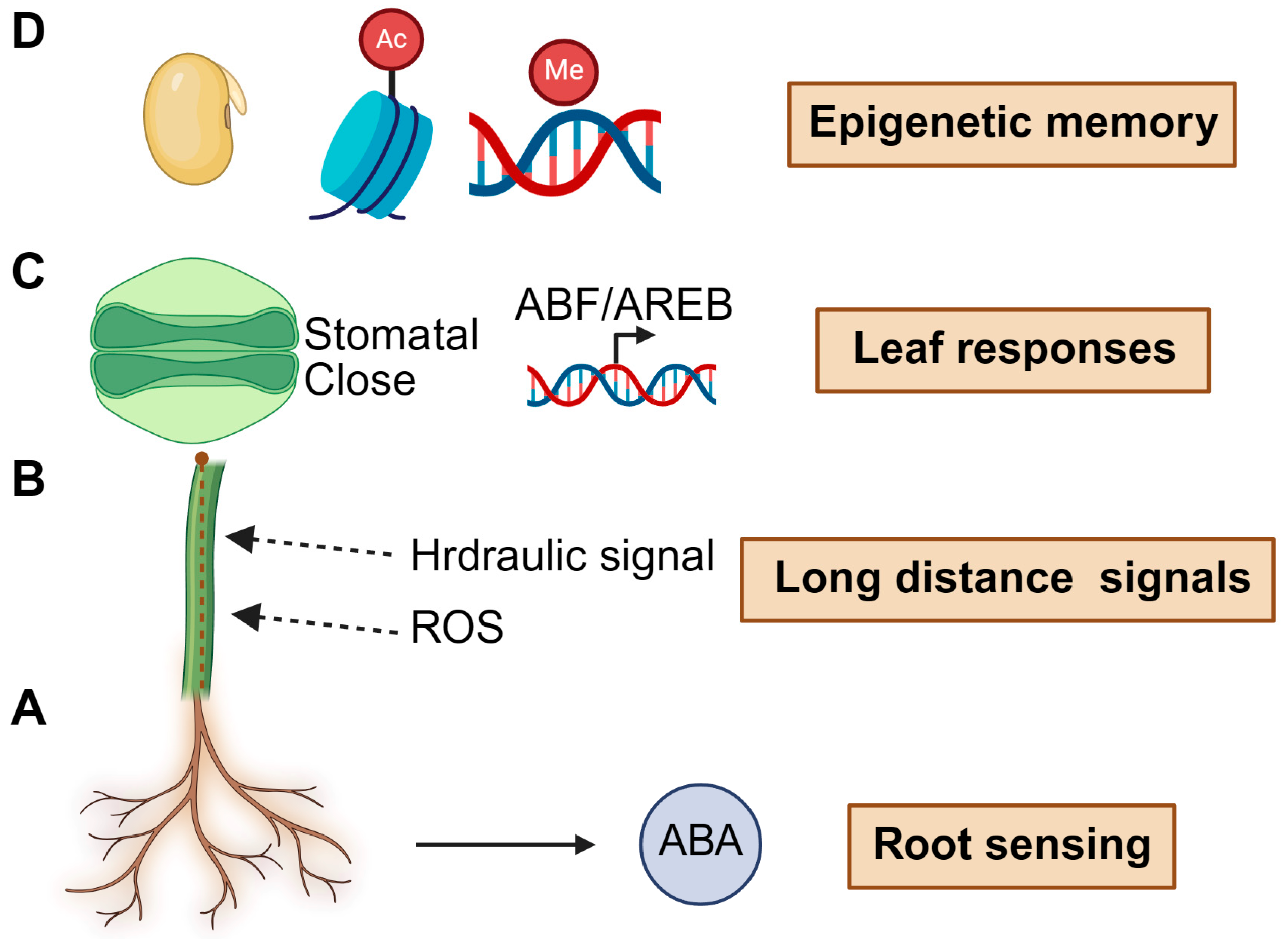 Figure 1. Integrated mechanisms of plant drought response: from root sensing to epigenetic memory. Drought stress triggers a multilayered response in plants that spans environmental sensing, systemic signaling, physiological adaptation, and long-term memory formation. (A) At the root level, cells detect declining soil water potential and initiate the biosynthesis of ABA. (B) These drought cues are then transmitted to aerial tissues via hydraulic signals and ROS traveling through the xylem. (C) In the leaves, ABA signaling induces stomatal closure by modulating ion channels and activates key drought-responsive transcription factors such as ABF/AREB. (D) At the chromatin level, epigenetic modifications-including histone acetylation and DNA methylation at stress-inducible loci-establish a form of drought memory, enabling plants to respond more rapidly and robustly upon re-exposure to drought, and in some cases, confer transgenerational resilience.
