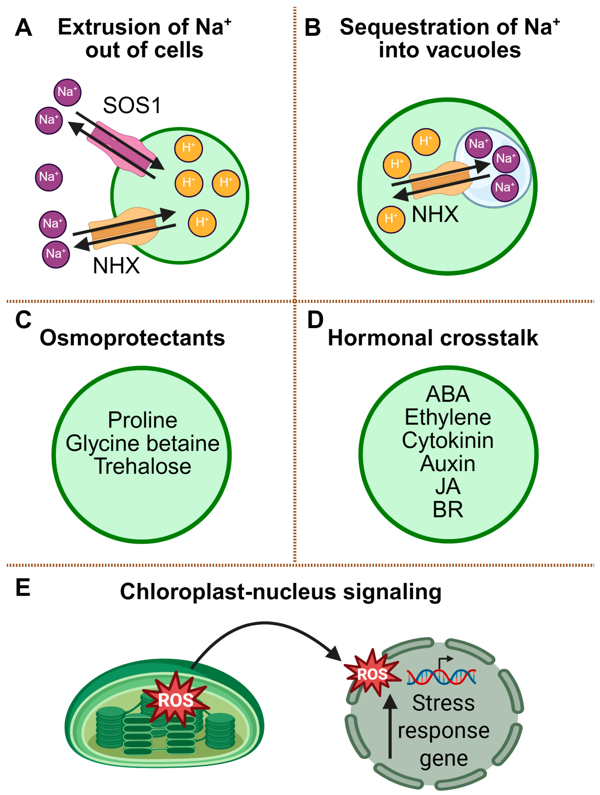 Figure 2. Salinity stress responses in plants. Key physiological and molecular mechanisms involved in plant adaptation to high salinity stress are shown. (A) Na+ extrusion is mediated by plasma membrane Na+/H+ antiporters (e.g., SOS1), which remove excess Na+ from the cytosol. (B) Vacuolar sequestration of Na+ via NHX-type Na+/H+ antiporters contributes to maintaining a favorable cytosolic K+/Na+ ratio. (C) Accumulation of compatible solutes such as proline, glycine betaine, and trehalose helps stabilize proteins and maintain osmotic balance. (D) Hormonal regulation involving ABA, ethylene, cytokinin, auxin, and jasmonic acid (JA) and brassinosteroid (BR) modulates stress signaling and plant development under saline conditions. (E) Salt stress induces the production of ROS in chloroplasts, which activate the expression of stress-responsive genes in the nucleus.