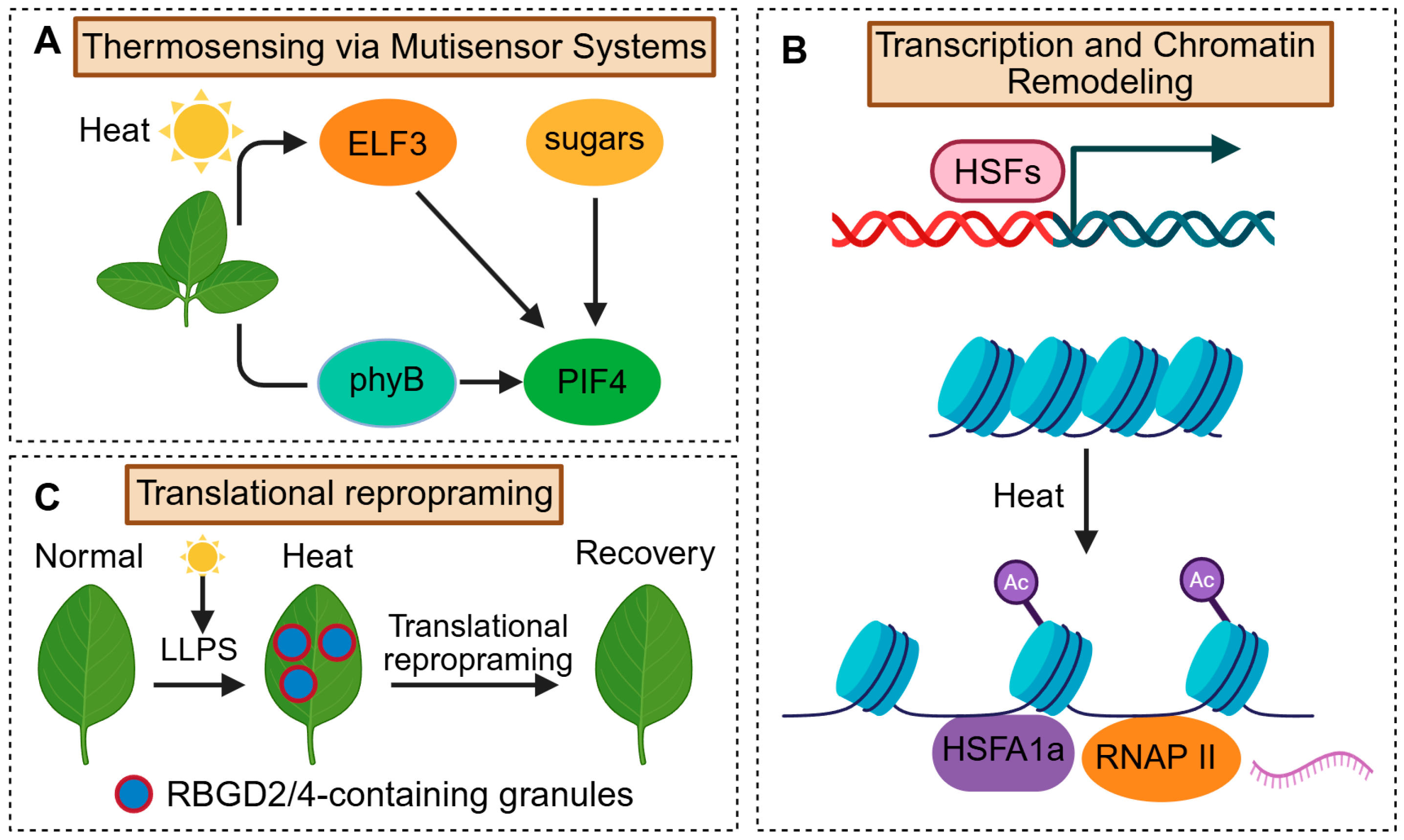 Figure 3. Multilayered mechanisms of plant heat stress responses. (A) Heat stress is sensed via multiple systems including phyB, ELF3, and sugar signals, all converging on PIF4 to drive thermomorphogenesis. (B) Heat activates HSFs such as HSFA1a, which induce heat-responsive gene expression and mediate chromatin remodeling. (C) Under heat, RBGD2/4 undergo LLPS to form stress granules, enabling translational reprogramming and promoting plant survival.