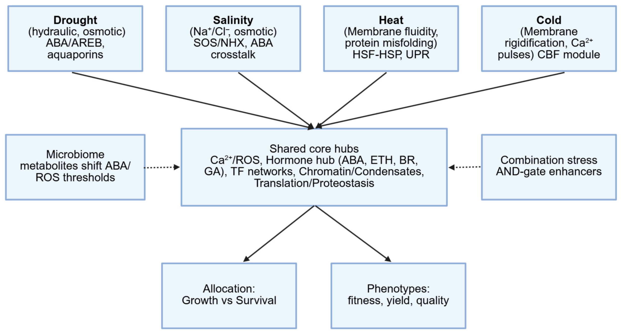 Figure 5. Conceptual framework linking single- and combined-stress responses. Drought, salinity, heat and cold converge on shared hubs (Ca2+/ROS, hormone crosstalk, TF networks, chromatin/condensates, translation/proteostasis) that allocate outputs to growth vs. survival and phenotypes. Dashed elements mark testable features relevant to combinations-AND-gate enhancers and microbiome-shifted ABA/ROS thresholds-which help explain the drought + heat conflicts (e.g., ABA-driven closure vs. heat-driven cooling) and salinity + cold co-regulation (CBF regulon with ion homeostasis and antioxidant programs). This schematic provides the backdrop for Section 2.5.1 and Section 2.5.2, where we detail ELF6-mediated DH acclimation, glutathione dependence under cold + osmotic stress, and the MsMYB12→MsFLS13 flavonoid module in alfalfa.