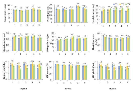 Agronomic properties per hybrids (1—Surimi CL, 2—Integral CL, 3—Alexa SU, 4—Neta SU, 5—Davero SU) in different plant densities (T1—84,034 plants/ha, T2—68,027 plants/ha, and T3—57,143 plants/ha). Error bars represent standard deviations. The letters above the columns indicate a statistical difference at the 5% level for each hybrid individually between treatments; NS—not significant.