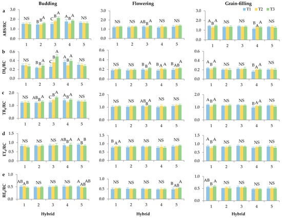 Chlorophyll a fluorescence parameters: (a) ABS/RC—absorption flux active per reactive centre (RC), (b) DI0/RC—dissipated energy flux per active RC, (c) TR0/RC—trapping flux per active RC, (d) ET0/RC—electron transport flux per active RC and (e) RE0/RC—electron flux reducing end electron acceptors PSI acceptor side per RC (relative units). Measurements were taken at budding, flowering and grain-filling stages of sunflower hybrids (1—Surimi CL, 2—Integral CL, 3—Alexa SU, 4—Neta SU, 5—Davero SU) grown under different plant densities (T1—84,034 plants/ha, T2—68,027 plants/ha, and T3—57,143 plants/ha). Error bars represent standard deviations. The letters above the columns indicate a statistical difference at the 5% level for each hybrid individually between treatments; NS—not significant.