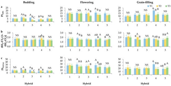 Chlorophyll a fluorescence parameters: (a) PIABS—performance index on absorption basis, (b) (RE0 − ET0)/[1 − (RE0 − ET0)]—electron transport from PQH2 to final PSI acceptors and (c) PITOTAL—performance index for energy conservation from exciton to the reduction in PSI terminal acceptors per budding, flowering and grain-filing stage of sunflower development and hybrids (1—Surimi CL, 2—Integral CL, 3—Alexa SU, 4—Neta SU, 5—Davero SU) in different plant densities (T1—84,034 plants/ha, T2—68,027 plants/ha, and T3—57,143 plants/ha). Error bars represent standard deviations. The letters above the columns indicate a statistical difference at the 5% level for each hybrid individually between treatments, NS—not significant.