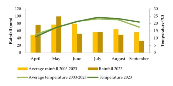 The mean monthly air temperature (°C) and total monthly rainfall (mm) during the 2023 growing season and a long-term (2003–2023) average rainfall and temperature in Osijek–Klisa are shown in Figure 5 (Croatian Meteorological and Hydrological Service). In April 2023, the daily air temperature was 1.7 °C less than the long-term average (2003–2023). Larger changes were observed in the increase in daily monthly temperatures in 2023 compared to the multi-year average in July (1 °C), August (0.8 °C) and September (3.4 °C). In 2023, the amount of rainfall from June to September was less than the long-term average. In June, precipitation was 35% less, in August by 24%, and in September by 43% compared to the twenty-year average. During the germination and emergence of sunflowers in 2023, about 56% more rainfall fell in April and 30% in May than the long-term average.