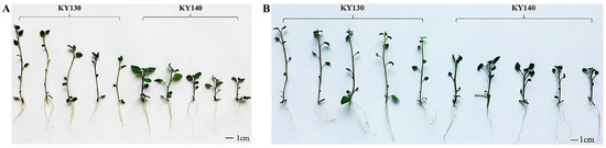 KY140 exhibited greater cold-induced leaf damage (57.1%) than that of KY130 (32.2%) after 7 days of CS and 12–24 h recovery at 22–25 °C (Figure 1A,B).