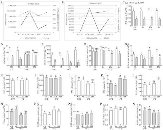 ELISA analysis revealed that caffeic acid levels were higher in the treatment groups (CS-KY140 and CS-KY130) than in the corresponding control groups (KY140 and KY130). Furthermore, the control group KY130 had higher caffeic acid content than that of the control KY140, while the CS-KY130 group showed higher levels than those of CS-KY140 (Figure 2A). These findings were consistent with the metabolomic data. Cinnamic acid levels in the treatment groups (CS-KY140 and CS-KY130) were higher than those in the corresponding control groups (KY140 and KY130) (Figure 2B), aligning with the metabolomic trends. Across all treatments, KY130 showed significantly higher antioxidant enzyme activities (CAT and SOD) and higher osmolyte contents (proline, soluble protein, and soluble sugar) than those of KY140 (Figure 2C–Q).