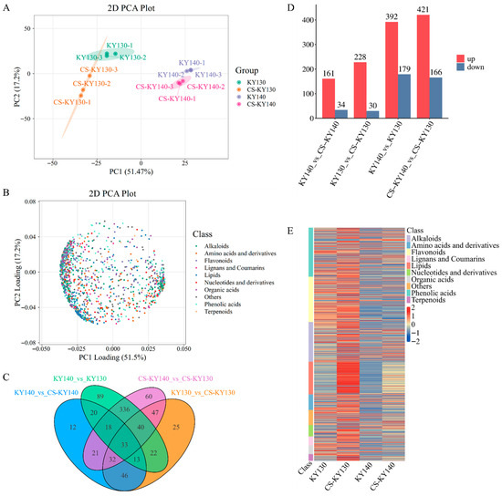 Metabolomic analysis of two potato cultivars exposed to CS. (A) PCA of metabolomic data derived from KY130 and KY140 in response to CS. (B) PCA loading plot of the same data, showing the contribution of different metabolite classes. (C) Venn diagram illustrating DAMs identified across four comparisons: KY140 vs. CS-KY140, KY130 vs. CS-KY130, KY140 vs. KY130, and CS-KY140 vs. CS-KY130. (D) Number of DAMs detected across the four comparisons (KY140 vs. CS-KY140, KY130 vs. CS-KY130, KY140 vs. KY130, and CS-KY140 vs. CS-KY130). (E) Heatmap showing the union of all DAMs detected across the four comparisons. “Class” indicates the first-level classification of DAMs. The horizontal axis represents cultivar names, and the vertical axis lists DAMs. Different colors represent relative metabolite abundance after standardization (red, higher content; blue, lower content). KY130, untreated KY130; CS-KY130, treated KY130; KY140, untreated KY140; CS-KY140, treated KY140. Abbreviations: CS, cold stress; KY130, potato cultivar KY130; KY140, potato cultivar KY140; CS-KY130, cold-stressed KY130; CS-KY140, cold-stressed KY140; PCA, principal component analysis; DAMs, differentially accumulated metabolites.