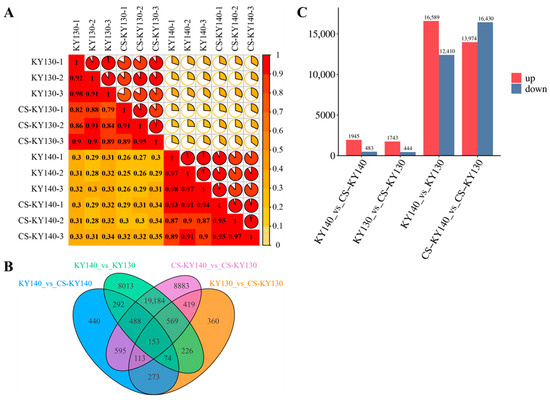 Transcriptomic analysis of two potato cultivars exposed to CS. (A) Correlation analysis of transcriptomic data across all experimental samples. (B) Venn diagram showing DEGs identified across four comparisons: KY140 vs. CS-KY140, KY130 vs. CS-KY130, KY140 vs. KY130, and CS-KY140 vs. CS-KY130. (C) Number of DEGs detected across the four comparisons (KY140 vs. CS-KY140, KY130 vs. CS-KY130, KY140 vs. KY130, and CS-KY140 vs. CS-KY130). KY130, untreated KY130; CS-KY130, treated KY130; KY140, untreated KY140; CS-KY140, treated KY140. Abbreviations: CS, cold stress; KY130, potato cultivar KY130; KY140, potato cultivar KY140; CS-KY130, cold-stressed KY130; CS-KY140, cold-stressed KY140; DEGs, differentially expressed genes.