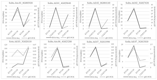 qRT-PCR was performed to validate the expression profiles of eight cold-tolerance-related DEGs in both potato cultivars under CS. The strong consistency between the qRT-PCR and RNA-Seq results confirmed the reliability and accuracy of the transcriptomic data (Figure 6).