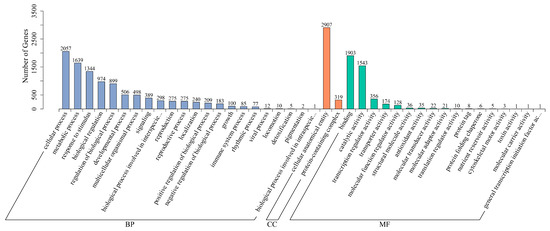 Gene Ontology (GO) enrichment analysis was conducted to elucidate the functional roles and biological processes associated with the DEGs in KY130 vs. CS-KY130 and KY140 vs. CS-KY140. Among the 4002 DEGs, 3379 were annotated to 41 GO categories, including “biological process,” “molecular function,” and “cellular component.” Most DEGs in the “biological process” category were enriched in “cellular process” and “metabolic process.” Within the “molecular function,” “binding” and “catalytic activity” represented the majority of DEGs annotations. In the “cellular component,” DEGs were exclusively classified under “cellular anatomical entity” and “protein-containing complex.” These findings suggest that these pathways are significant involved in the response of the potato to CS (Figure 7).