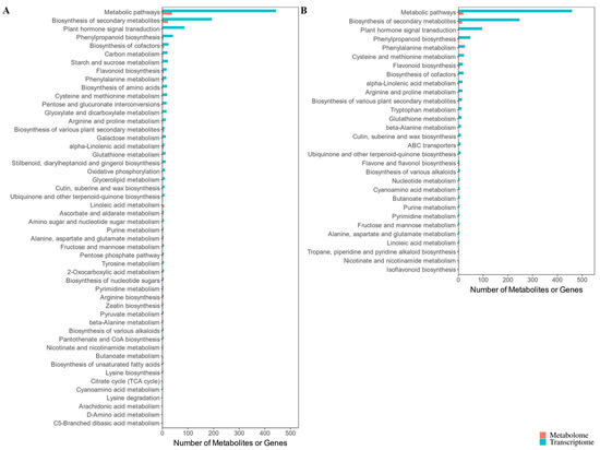 Integrated KEGG pathway analysis of DAMs and DEGs. (A) KY130 vs. CS-KY130 DAMs and DEGs common KEGG enrichment bar. (B) KY140 vs. CS-KY140 DAMs and DEGs common KEGG enrichment bar. The overlapping KEGG pathways identified between the two omics datasets are presented as bar charts displaying the number of DAMs and DEGs enriched within each pathway. When > 50 KEGG pathways were shared, only the top 50—ranked according to p-value with reference to the transcriptomic data—are shown. When < 50 enriched pathways are identified, all are displayed. The length of each bar (x-axis) indicates DAM/DEG counts, while their position (y-axis) shows the corresponding KEGG pathway. KY130, untreated KY130; CS-KY130, treated KY130; KY140, untreated KY140; CS-KY140, treated KY140. Abbreviations: KEGG, Kyoto Encyclopedia of Genes and Genomes; KY130, potato cultivar KY130; KY140, potato cultivar KY140; CS-KY130, cold-stressed KY130; CS-KY140, cold-stressed KY140; DAMs, differentially accumulated metabolites; DEGs, differentially expressed genes; CS, cold stress.