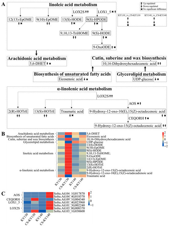 Integrated metabolomic and transcriptomic analysis of DAMs and DEGs associated with “lipid metabolism” in potatoes under CS. (A) Schematic representation of the “lipid metabolic pathway.” Arrow-headed lines indicate connections between DAMs, with enzymes positioned along each line. Solid lines indicate direct interactions between DAM molecules, while dashed lines represent indirect connections with intervening metabolites. DAMs and DEGs were analyzed through KEGG pathway mapping to elucidate their potential roles in systemic biological processes [https://www.kegg.jp/kegg/pathway.html (accessed on 8 July 2024)]. (B) Heatmap of DAMs associated with lipid metabolism. The horizontal axis represents sample names, while the vertical axis corresponds to the KEGG pathway. Colors represent different values obtained following the standardization of relative contents (red, higher content; blue, lower content). (C) Heatmap depicting DEGs encoding key enzymes involved in “lipid metabolism.” The horizontal axis represents sample names, while the vertical axis denotes the corresponding enzymes and DEGs. Distinct colors represent standardized values of various relative contents (red, higher content; blue, lower content). KY130, untreated KY130; CS-KY130, treated KY130; KY140, untreated KY140; CS-KY140, treated KY140. Abbreviations: KEGG, Kyoto Encyclopedia of Genes and Genomes; KY130, potato cultivar KY130; KY140, potato cultivar KY140; CS-KY130, cold-stressed KY130; CS-KY140, cold-stressed KY140; DAMs, differentially accumulated metabolites; DEGs, differentially expressed genes; CS, cold stress; LOX2S, lipoxygenase; LOX1_5, linoleate 9S-lipoxygenase; AOS, hydroperoxide dehydratase; CEQORH, chloroplastic oxoene reductase.