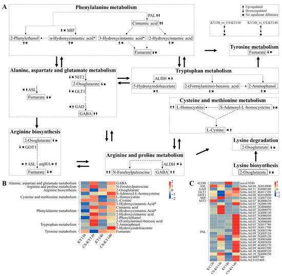 Integrated metabolomic and transcriptomic analysis of DAMs and DEGs associated with “amino acid metabolism” in potatoes under CS. (A) Schematic representation of the “amino acid metabolic pathway.” Arrow-headed lines connect DAMs, with enzymes positioned along each line. Solid lines indicate direct interactions between DAM molecules, while dashed lines represent indirect connections with intervening metabolites. DAMs and DEGs were analyzed through KEGG pathway mapping to elucidate their potential roles in systemic biological functions [https://www.kegg.jp/kegg/pathway.html (accessed on 8 July 2024)]. (B) Heatmap of DAMs associated with amino acid metabolism. The horizontal axis represents sample names, while the vertical axis corresponds to the KEGG pathway. To prevent redundancy, DAMs involved in multiple pathways are shown in a single representative pathway. Asterisks (*) represent the presence of metabolite isomers. Colors indicate standardized values of the relative contents (red, higher content; blue, lower content). (C) Heatmap illustrating DEGs encoding key enzymes involved in amino acid metabolism. The horizontal axis represents sample names, while the vertical axis corresponds to the enzymes and DEGs. Distinct colors represent the standardized values of various relative contents (red, higher content; blue, lower content). KY130, untreated KY130; CS-KY130, treated KY130; KY140, untreated KY140; CS-KY140, treated KY140. Abbreviations: KEGG, Kyoto Encyclopedia of Genes and Genomes; KY130, potato cultivar KY130; KY140, potato cultivar KY140; CS-KY130, cold-stressed KY130; CS-KY140, cold-stressed KY140; DAMs, differentially accumulated metabolites; DEGs, differentially expressed genes; CS, cold stress; MIF, Phenylpyruvate tautomerase; PAL, phenylalanine ammonia-lyase; ASL, argininosuccinate lyase; NIT2, omega-amidase; GLT1, glutamate synthase (NADH); GAD, glutamate decarboxylase; GOT1, aspartate aminotransferase, cytoplasmic; argHA, argininosuccinate lyase/amino-acid N-acetyltransferase; ALDH, aldehyde dehydrogenase (NAD+).