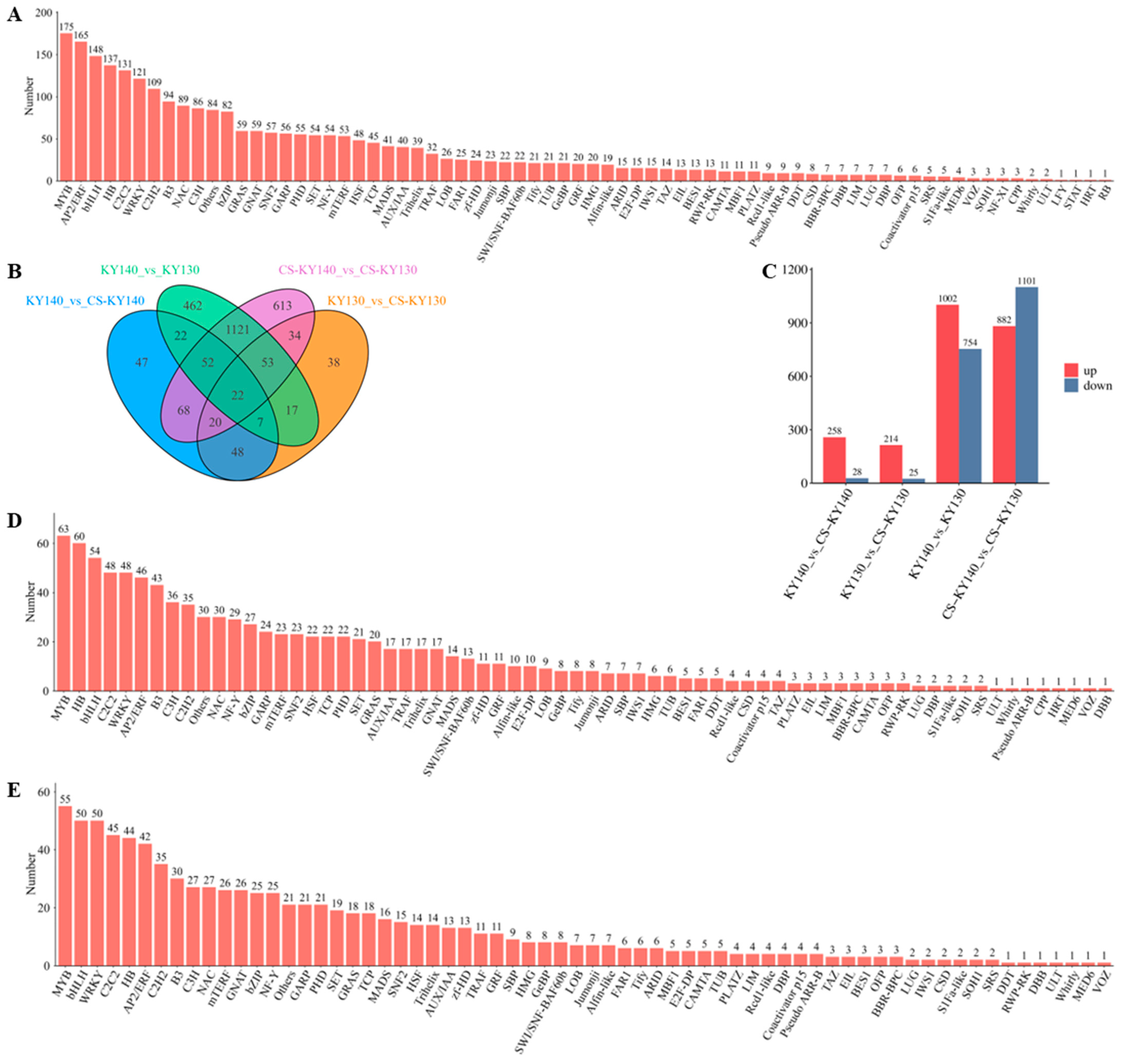 Analysis of TFs across four comparisons: KY140 vs. CS-KY140, KY130 vs. CS-KY130, KY140 vs. KY130, and CS-KY140 vs. CS-KY130. (A) Classification of TF families (bar chart) across the four comparisons (KY140 vs. CS-KY140, KY130 vs. CS-KY130, KY140 vs. KY130, and CS-KY140 vs. CS-KY130). (B) Venn diagram showing differentially expressed TFs identified across the four comparisons (KY140 vs. CS-KY140, KY130 vs. CS-KY130, KY140 vs. KY130, and CS-KY140 vs. CS-KY130). (C) Number of differentially expressed TFs detected across the four comparisons. KY130, untreated KY130; CS-KY130, treated KY130; KY140, untreated KY140; CS-KY140, treated KY140. (D) Analysis of TFs upregulated in KY140 vs. KY130 and in (E) CS-KY140 vs. CS-KY130. Abbreviations: TFs, transcription factors; KY130, potato cultivar KY130; KY140, potato cultivar KY140; CS-KY130, cold-stressed KY130; CS-KY140, cold-stressed KY140.