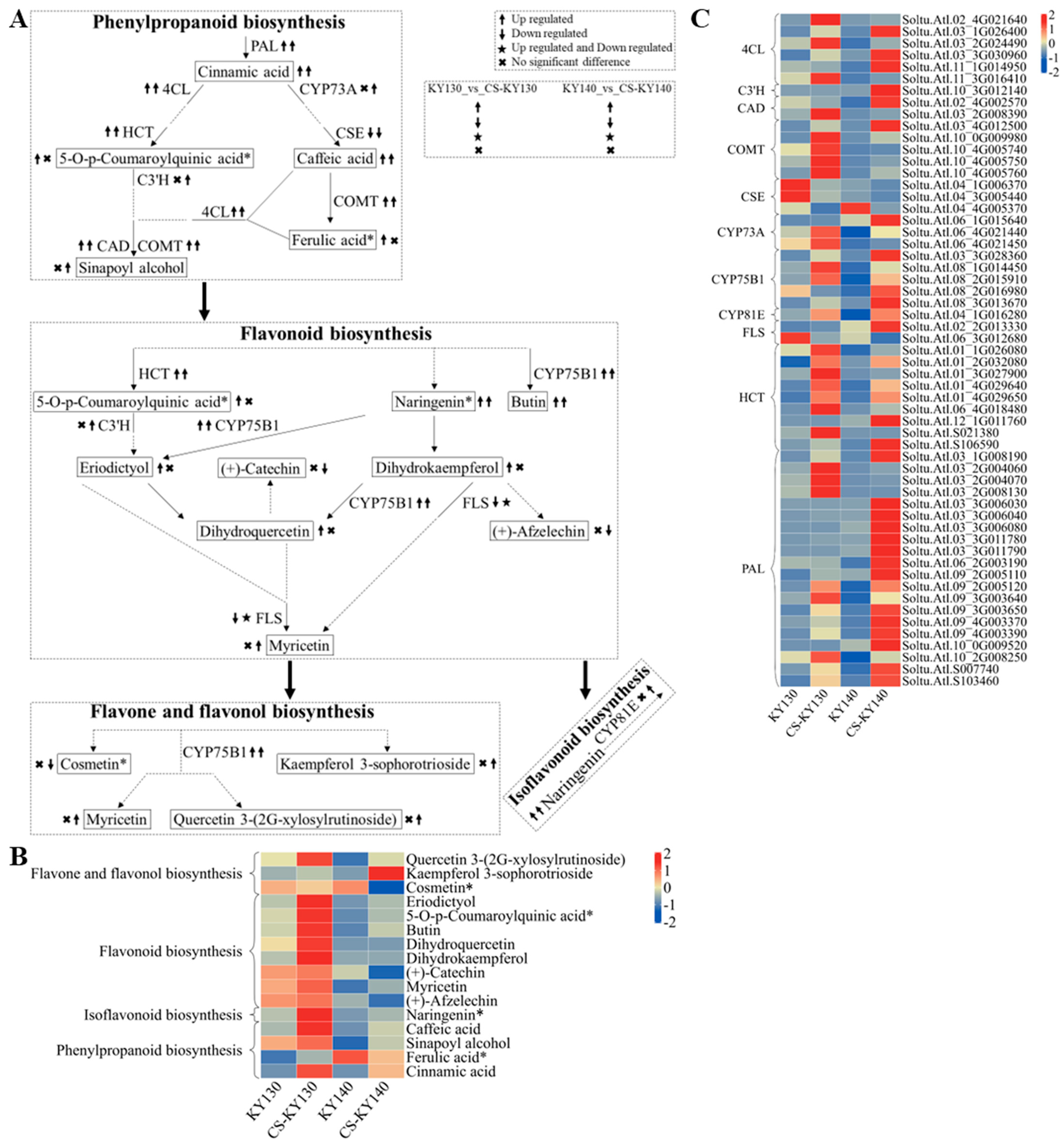 Integrated metabolomic and transcriptomic analysis of DAMs and DEGs associated with “flavonoid-related metabolism in potatoes under CS. (A) Schematic representation of the “flavonoid-related metabolic pathway.” Arrow-headed lines connect the DAMs at both ends, with enzymes positioned along each line. Solid lines indicate direct interactions between DAMs, while dashed lines represent indirect connections through intermediate metabolites. DAMs and DEGs were analyzed through KEGG pathway mapping to elucidate their potential roles in systemic biological functions [https://www.kegg.jp/kegg/pathway.html (accessed on 8 July 2024)]. (B) Heatmap of DAMs associated with flavonoid-related metabolism. The horizontal axis represents the sample names, while the vertical axis denotes the KEGG pathway. To prevent redundancy, DAMs involved in multiple pathways are presented within a single representative pathway. Asterisks (*) indicate the presence of metabolite isomers. Distinct colors denote relative metabolite abundance after standardization (red, higher content; blue, lower content). (C) Heatmap illustrating DEGs encoding key enzymes involved in flavonoid-related metabolism. The horizontal axis represents the sample names, while the vertical axis denotes the corresponding enzymes and DEGs. Distinct colors denote standardized relative expression levels (red, higher content; blue, lower content). KY130, untreated KY130; CS-KY130, treated KY130; KY140, untreated KY140; CS-KY140, treated KY140. Abbreviations: KEGG, Kyoto Encyclopedia of Genes and Genomes; KY130, potato cultivar KY130; KY140, potato cultivar KY140; CS-KY130, cold-stressed KY130; CS-KY140, cold-stressed KY140; DAMs, differentially accumulated metabolites; DEGs, differentially expressed genes; CS, cold stress; PAL, phenylalanine ammonia-lyase; 4CL, 4-coumarate:CoA ligase; HCT, shikimate O-hydroxycinnamoyltransferase; CYP73A, trans-cinnamate 4-monooxygenase; CSE, caffeoyl shikimate esterase; C3′H, 5-O-(4-coumaroyl)-D-quinate 3′-monooxygenase; CAD, cinnamyl-alcohol dehydrogenase; COMT, caffeic acid 3-O-methyltransferase; CYP75B1, flavonoid 3′-monooxygenase; FLS, flavonol synthase; CYP81E, isoflavone/4′-methoxyisoflavone 2′-hydroxylase.