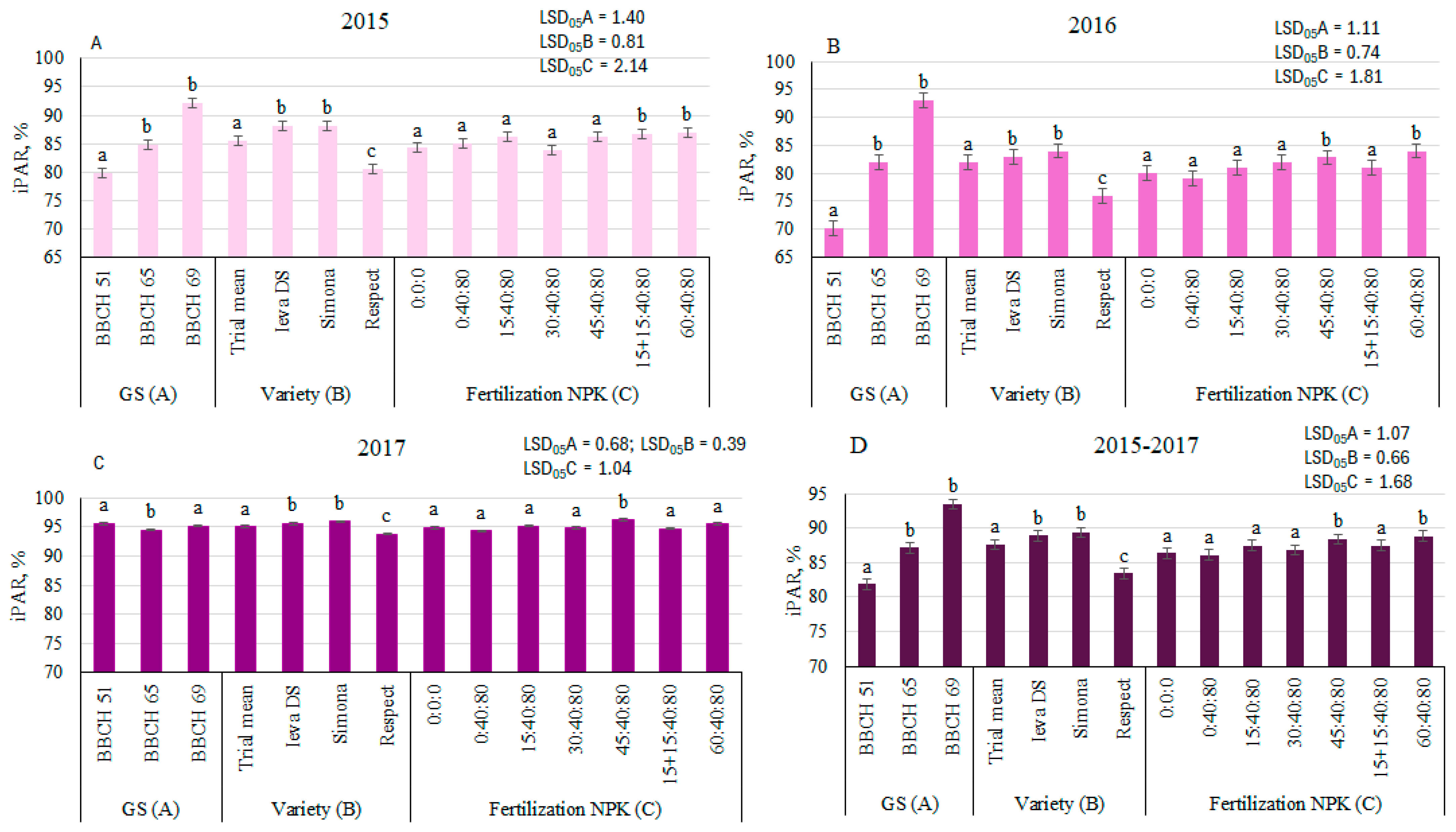 - Jena, S.; Basu, S.; Maji, S.; Bandyopadhyay, P.; Nath, R.; Chakraborty, P.K. Variation in absorption of photosynthetic active radiation (PAR) and PAR use efficiency of wheat and mustard grown under intercropping system. Bioscan 2015, 10, 107–112. [Google Scholar]