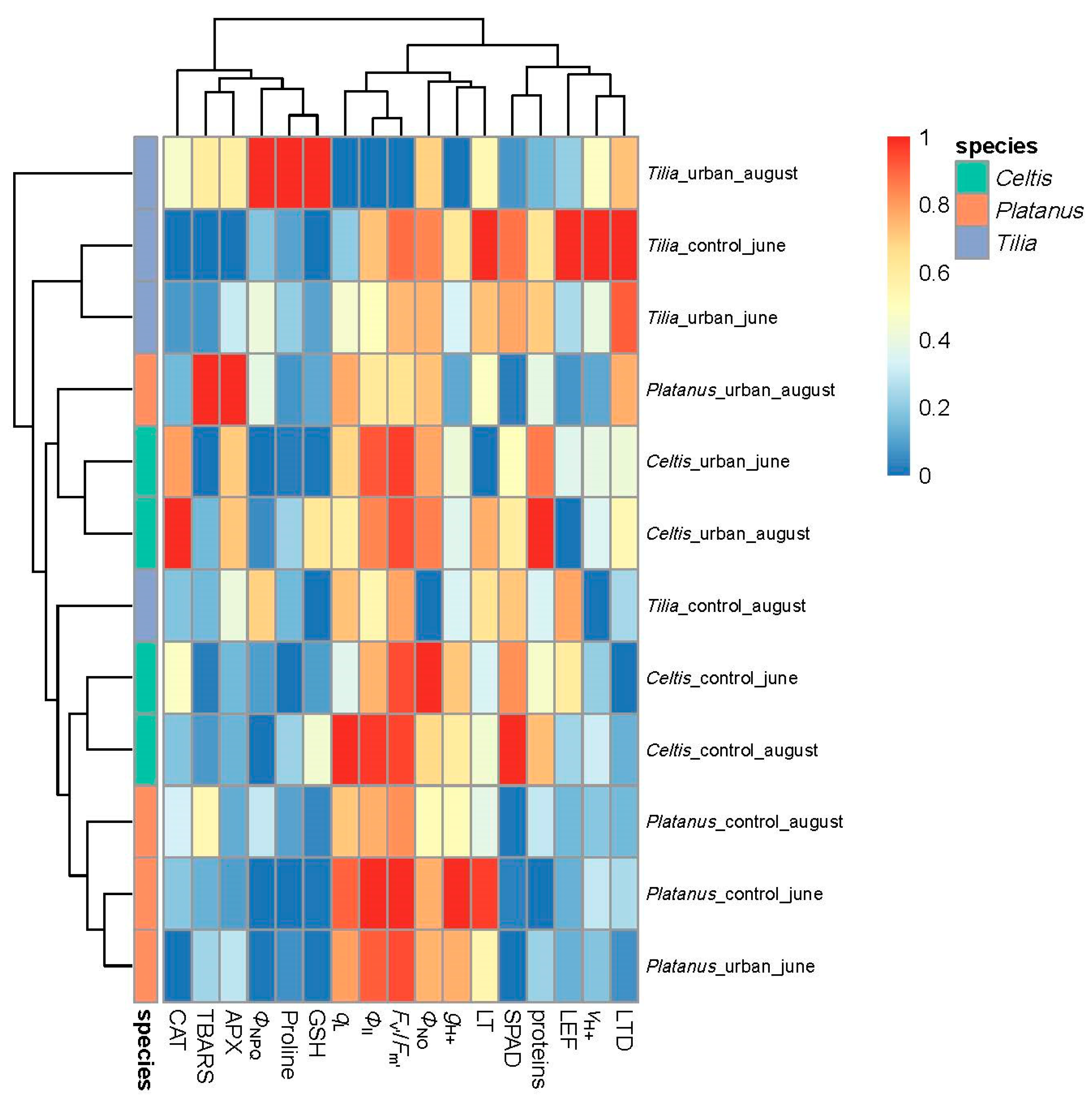 Arsenov, D.; Borišev, M.; Nikolić, N.; Horak, R.; Pajević, S. Physiological and Biochemical Indicators of Urban Environmental Stress in Tilia, Celtis, and Platanus: A Functional Trait-Based Approach. Plants 2025, 14, 3451. https://doi.org/10.3390/plants14223451