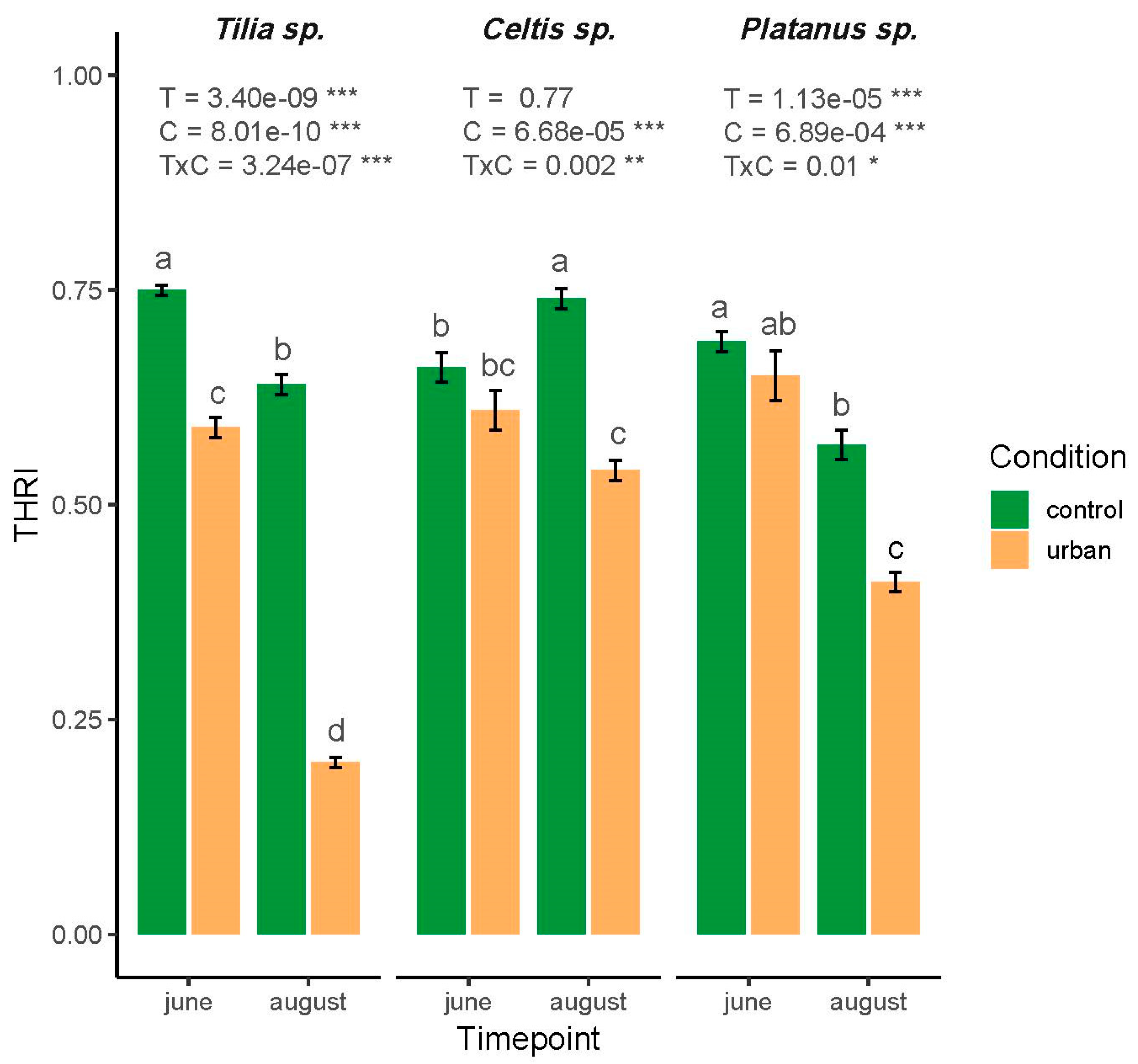 2.4. Tree Health Risk Index of Tree Species to Urban Stress
