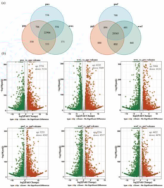 Further analysis identified 550, 536 and 371 shared specific expressed among the pps, pws and wws samples, and 880, 708 and 468 shared specific expressed among the ppf, pwf and wwf (Figure 3a). Utilising a p-value cut-off of 0.05 and a |log2 fold change| of at least 1, a total of 10,892, 11,581, and 9208 differentially expressed genes (DEGs) were identified in the pws_vs_pps, wws_vs_pps, and wws_vs_pws samples, respectively. Among these genes, 5758, 6532, and 5084 up-regulated genes and 5134, 5049, and 4124 down-regulated genes were identified in the pws_vs_pps, wws_vs_pps, and wws_vs_pws treatment groups, respectively (Figure 3b).