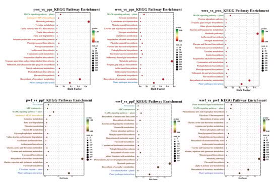 In order to validate the enrichment of these GO terms across the entire transcriptome, gene set enrichment analysis (GSEA) was employed to compare pps, pws, wws, ppf, pwf, and wwf. It is noteworthy that genes implicated in the flavonoid biosynthesis pathway exhibited substantial enrichment and were distinctly overexpressed in pps and wws (Figure S1). The DEGs were then categorised into three groups via the GO database: molecular function, cellular component, and biological process (Figure S2). An analysis of differentially expressed genes in D. alata skin and flesh revealed that the majority were predominantly distributed in the cellular component and molecular function categories. KEGG pathway enrichment analysis revealed that, in D. alata skin, differentially expressed genes were primarily enriched in metabolic pathways, including Biosynthesis of secondary metabolites, Flavonoid biosynthesis, and Metabolic pathways (Figure 4). An analysis of differentially expressed genes in potato flesh revealed that the majority were predominantly enriched in metabolic pathways, including those involved in the Biosynthesis of secondary metabolites, Flavonoids, Anthocyanins and Metabolic pathways. Genes associated with anthocyanin synthesis and regulation constituted a substantial proportion within these pathways, including F3H, ANS, and UGT.