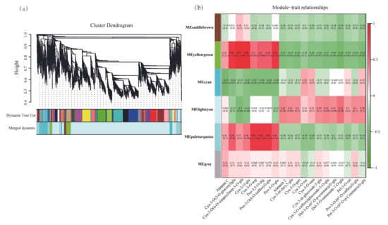 Gene co-expression network analysis among different D. alata. (a) Hierarchical clustering tree showing 6 modules of coexpressed genes by WGCNA. (b) Module–trait relationships. Each column represents a module, and each row represents a type of anthocyanin.