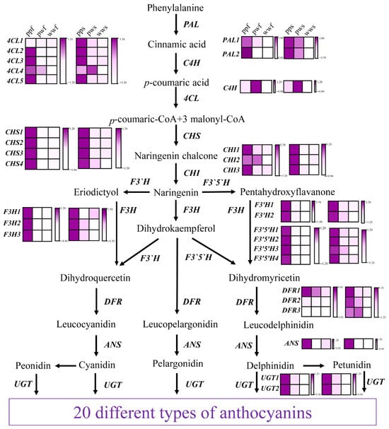 Transcriptional levels were analysed for 30 candidate genes associated with anthocyanin biosynthesis, which had been identified through the use of homology mapping with other species (Figure 6). In the context of the phenylalanine-to-naringenin biosynthetic pathway, a comprehensive analysis was conducted to elucidate the regulatory mechanisms underlying the control of anthocyanin deposition. The investigation revealed that upstream of this pathway, two PAL genes (PAL1, 2), one C4H (C4H), five 4CLs (4CL1, 2, 3, 4, 5), four CHS genes (CHS1, 2, 3), and three CHIs (CHI1, 2, 3) exhibited significant upregulation in both ppf and pps. Notably, the expression levels of these genes were found to be higher in the flesh compared to the skin, suggesting a potential role for these genes in regulating anthocyanin deposition.