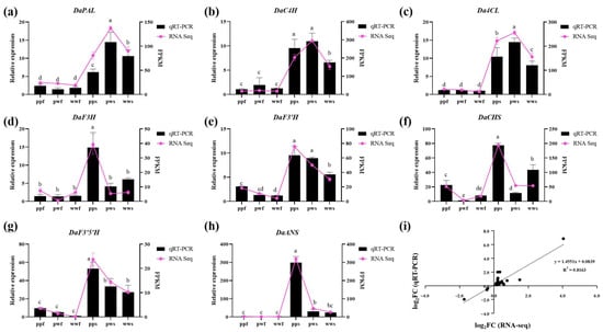 RT-qPCR of the key anthocyanin-related genes. (a–h) Expression levels of 8 genes in RT-qPCR and FPKM values in RNA-seq. (i) Correlation analysis of the gene expression ratios between RT-qPCR and RNA-seq. Different letters denote significant differences according to the Tukey’s test (p < 0.05).