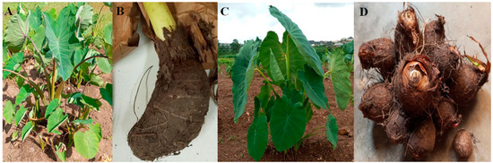 Taro (Colocasia esculenta (L.) Schott) is a perennial monocot crop that is often grown as an annual in tropical and subtropical countries [1,2,3]. Although its origin is in the Indo-Malayan region of Southeast Asia [4], taro has been widely cultivated in sub-Saharan Africa (SSA) for several centuries. It has become an important food security crop in the region and is mainly grown as a mixed crop in farms and backyards [3,5,6]. Compared to other root and tuber crops, such as cassava, yams, and sweetpotato, taro corms and leaves are rich in protein with highly digestible starch, rich in minerals such as calcium, potassium, iron, and magnesium, and are a source of vitamin E, C, and B complex [7,8,9,10,11,12,13,14]. Taro is propagated vegetatively using a variety of planting materials, including side shoots, corms, and cormels sourced from their farms or neighboring farms [13,15].